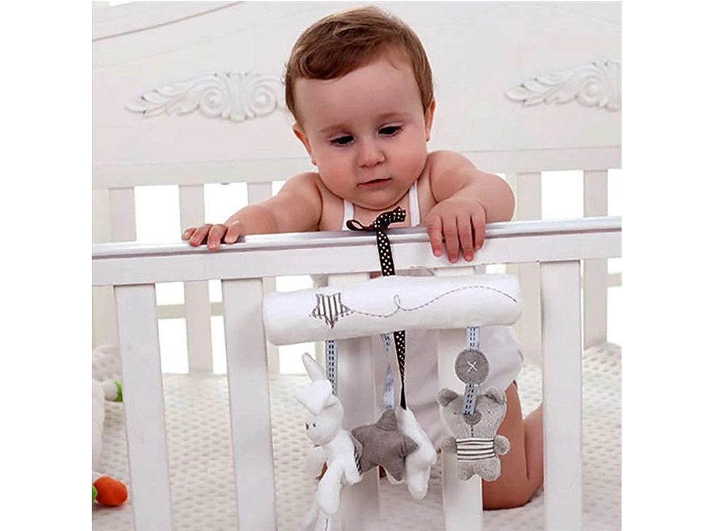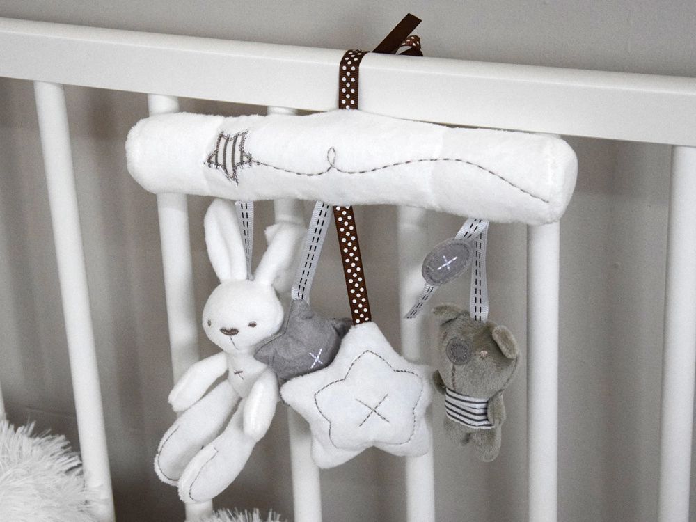 Dieses weiche Hängespielzeug verbindet ein beruhigendes Design in Weiß-Grau-Tönen mit funktionaler Sinnesstimulation. Dank der universellen Bänder befestigen Sie es im Handumdrehen am Bettchen, Kinderwagen oder an der Spielbogenstange und bieten dem Baby anregenden Spielspaß beim Ausruhen und unterwegs.