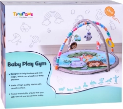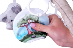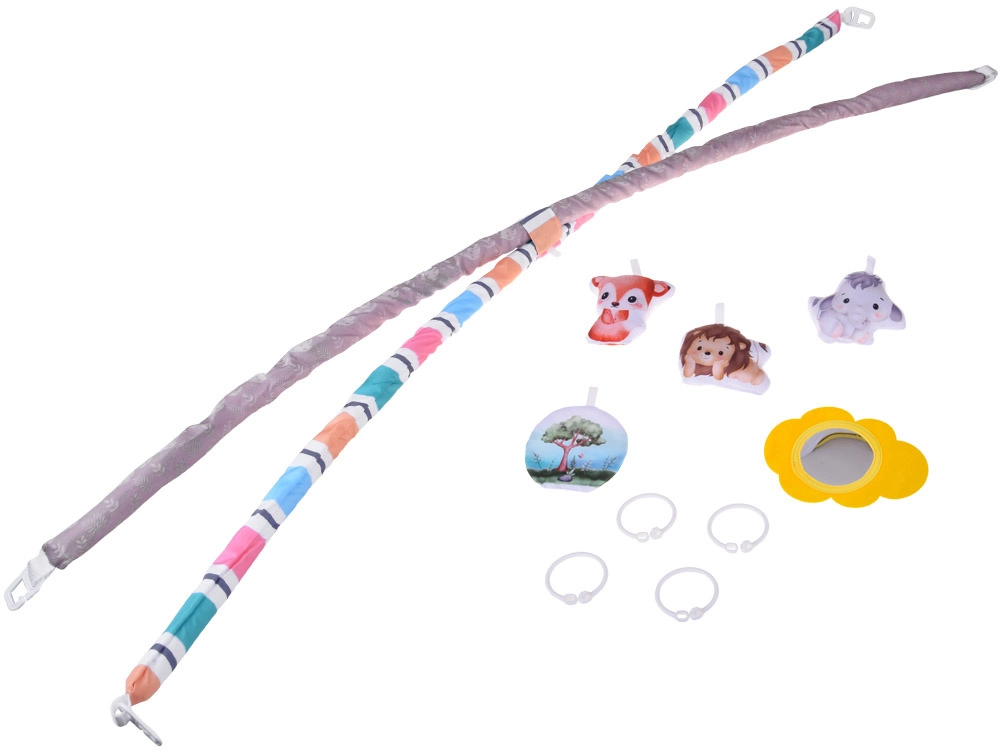 Zwei gepolsterte, flexible Bögen mit hängenden Plüschtieren und Spiegel motivieren das Baby zum Greifen, Festhalten und Strampeln – ideal zum Training der Hand-Auge-Koordination und zur Stärkung der Muskeln.