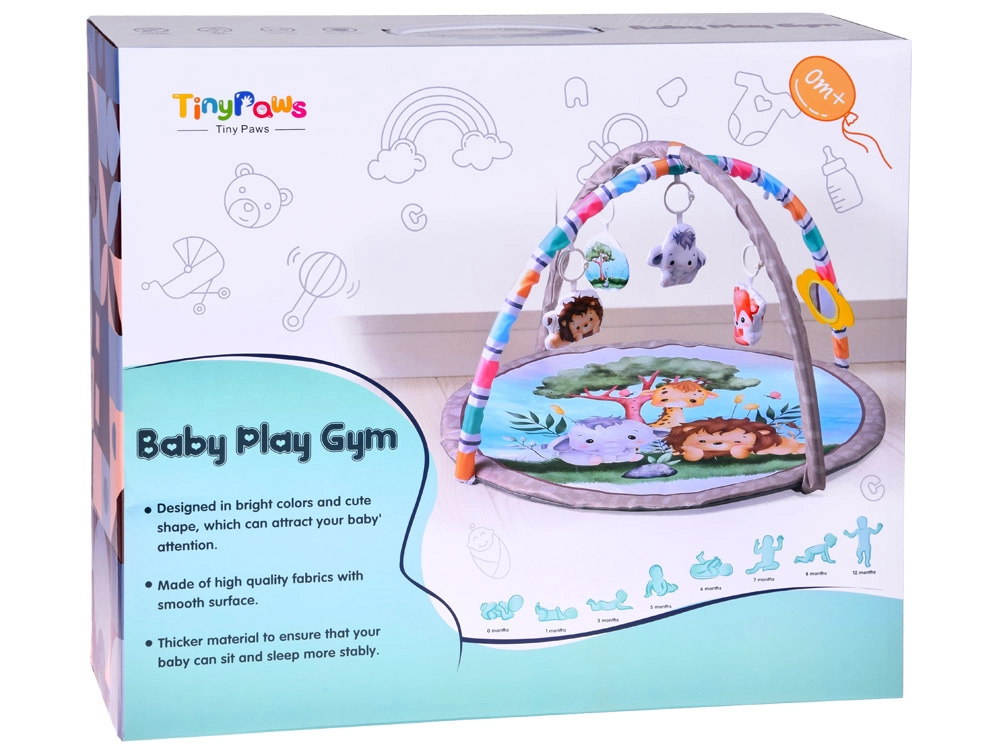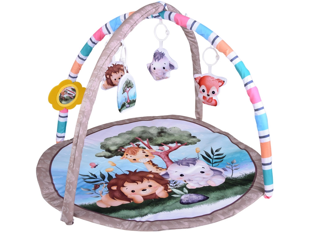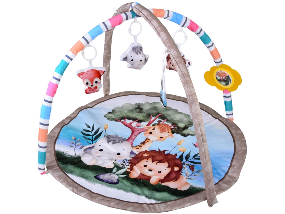 Diese runde Lernmatte mit Safari-Motiven (Löwe, Elefant, Giraffe) bietet eine weiche und gemütliche Umgebung, die Neugier und eigenständiges Entdecken anregt. Zwei gepolsterte, gekreuzte Bögen mit hängenden Spielzeugen und einem sicheren, unzerstörbaren Spiegel laden das Baby zum Ausstrecken, Greifen und Strampeln ein und fördern so die grobe und feine Motorik.