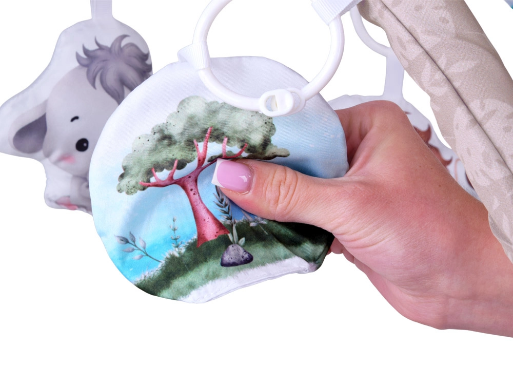 Der niedliche Fuchs, der kleine Löwe, der Elefant, der knisternde Baum und der sichere Spiegel lassen sich leicht versetzen oder abnehmen. So entdeckt das Kind verschiedene Formen, Strukturen und Geräusche und trainiert die Feinmotorik.