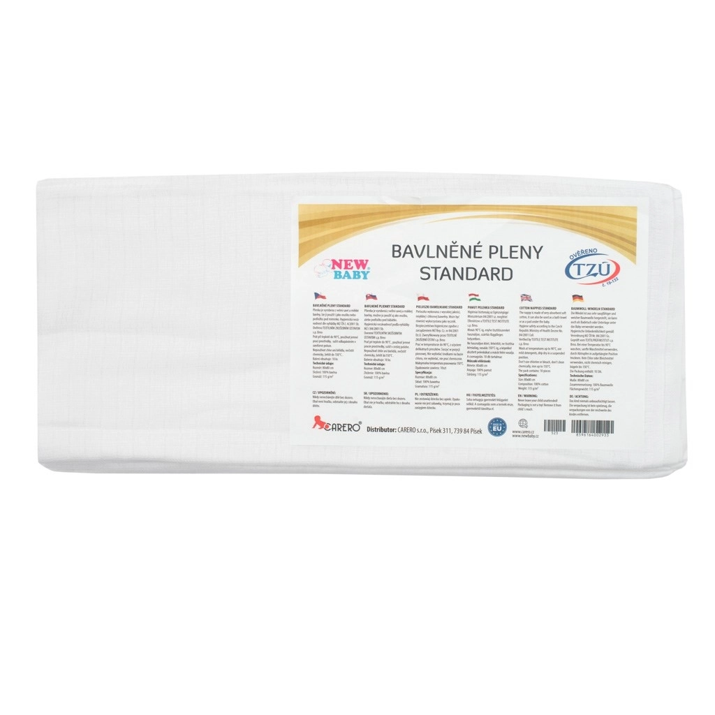 Klassische Baumwollwindeln NEW BABY im Maß 80×80 cm sind ideal für den täglichen Gebrauch. Sie bestehen aus 100 % Baumwolle mit einem Flächengewicht von 115 g/m² und besitzen 2 feste und 2 eingesäumte Kanten für höhere Strapazierfähigkeit und Formstabilität. Die Packung enthält 10 Stück. Die Windeln sind vom Textilprüfinstitut in Brünn geprüft. Trocknen im Wäschetrockner wird nicht empfohlen.