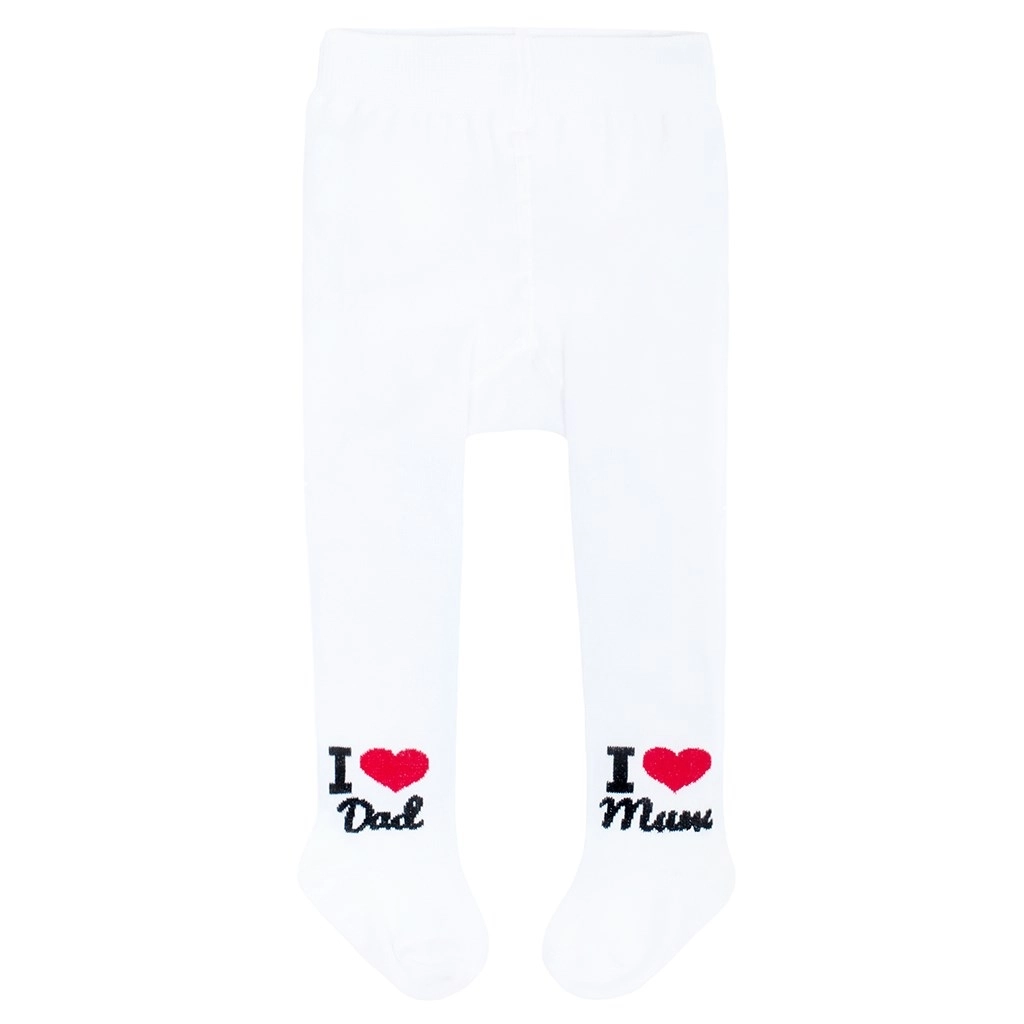 Süße Kinderstrumpfhose von New Baby in Weiß mit den Aufschriften I Love Mum und I Love Dad – perfekt für kleine Komfortfans. Sie besteht aus hochwertigem Material, das formstabil ist und nicht abfärbt, sodass sie auch nach häufigem Waschen toll aussieht. Ideal für den Alltag in der Größe 68 (4–6 Monate).