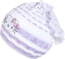 Diese stylische gestrickte Mütze–Tuch NEW BABY in zartem Lila schützt den Kinderkopf vor Wind und kühlerem Frühlingswetter. Dank des natürlichen Materials ist sie atmungsaktiv, weich und angenehm zur Haut. Das Kätzchen-Design mit glitzernden Steinchen verleiht dem Outfit einen verspielten Look.