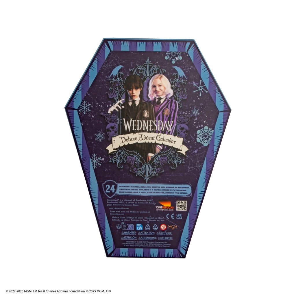 Dieser exklusive Adventskalender in Sargform begeistert jeden WEDNESDAY-Fan. Im Inneren finden Sie sorgfältig gestaltete Fächer mit 24 thematischen Überraschungen, die Spaß, Praktikabilität und Sammlerwert vereinen. Dank des auffälligen Designs ist der Kalender auch als dekoratives Geschenk für die Feiertage ideal.