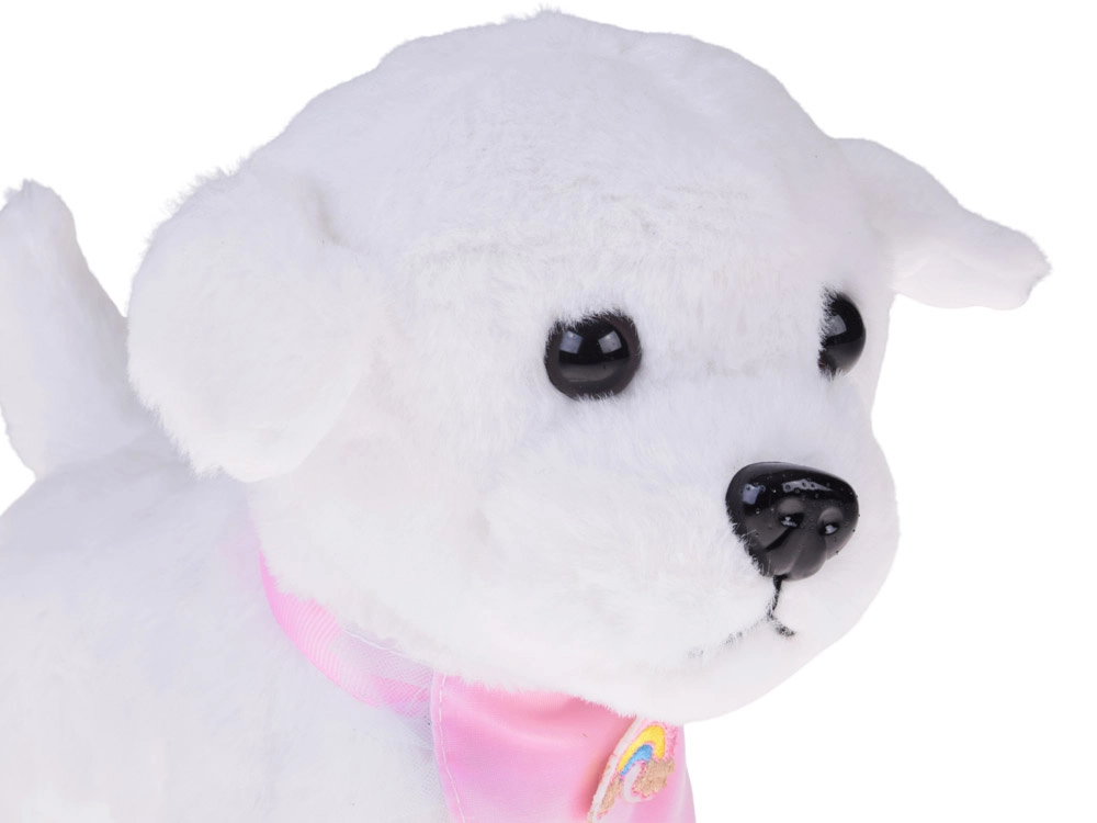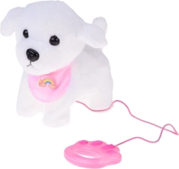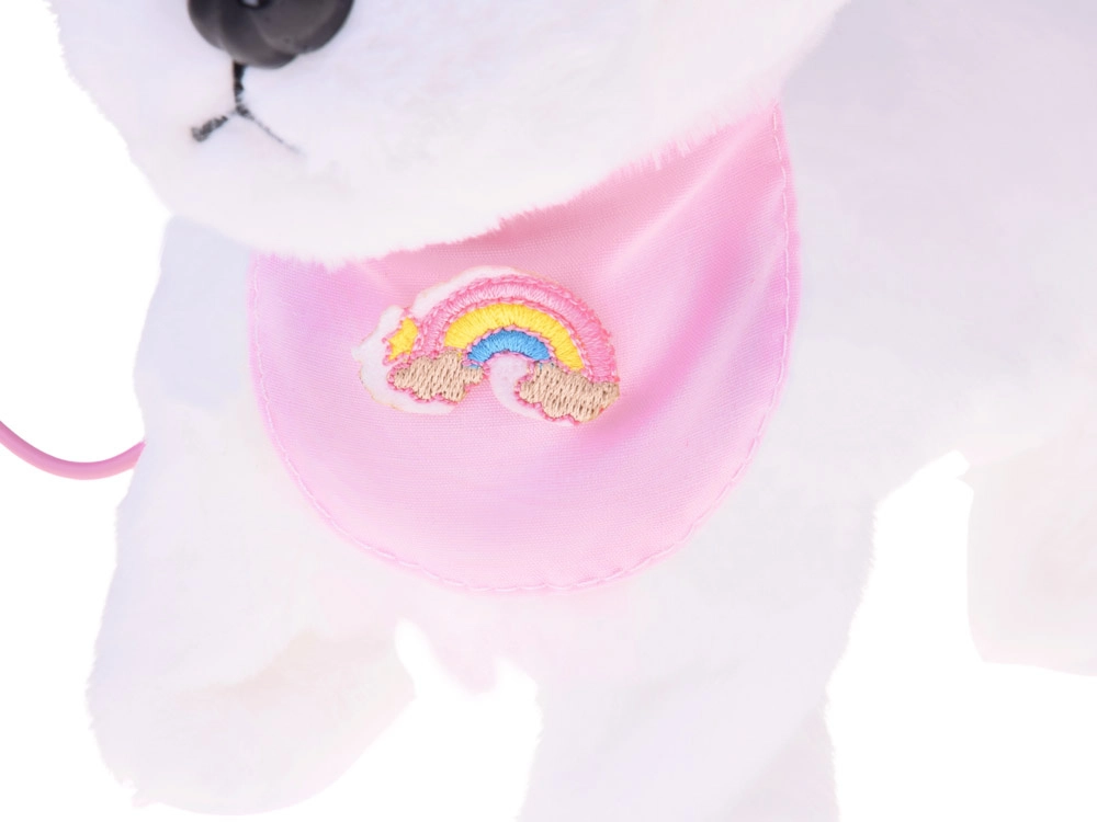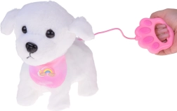 Der niedliche interaktive Plüschhund an der Leine begeistert jeden kleinen Tierliebhaber. Beim Drücken der Taste an der Leine läuft er, bellt, gibt realistische Geräusche von sich und wackelt mit dem Schwanz. Er besteht aus weichem, angenehm zu berührendem Material und trägt ein niedliches Bandana mit Regenbogen – der ideale Freund für den Alltag und ein tolles Geschenk.