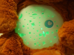 Der Plüschbär mit Sternenprojektor hilft Kindern, schneller und ruhiger einzuschlafen. Aus dem Bäuchlein des Bären werden Sterne, Mond, Planeten und Raketen projiziert, begleitet von beruhigenden Melodien und sanft wechselndem Licht. Dank der zweistufigen Lautstärkeregelung lässt sich der Klang leicht an empfindliche Babyohren anpassen.