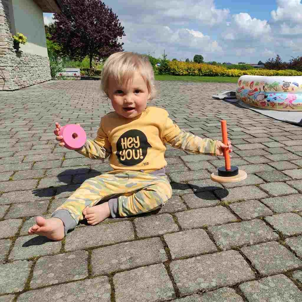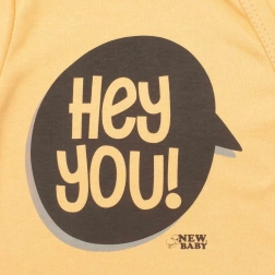 Das senfgelbe Baby-T-Shirt NEW BABY With Love ist die ideale Wahl für den Alltag. Die weiche, atmungsaktive 100 % Baumwolle sorgt für maximalen Komfort und ist auch für empfindliche Haut geeignet. Kontrastierende graue Säume und der verspielte Schriftzug Hey You! verleihen dem T-Shirt einen modernen Look.