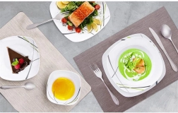 Dieses quadratische Tafelservice aus hochwertigem Porzellan bringt Stil und Praktikabilität in jeden Haushalt. Das moderne Dekor in Grün, Schwarz und Grau kommt auf dem Tisch wunderschön zur Geltung und lässt sich leicht mit weiterer Ausstattung kombinieren. Ideal für Frühstück, Mittag- und Abendessen sowie perfekt für Familientreffen und festliche Tafeln.