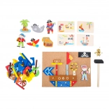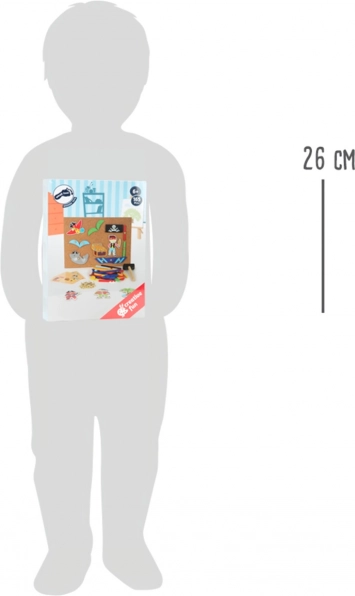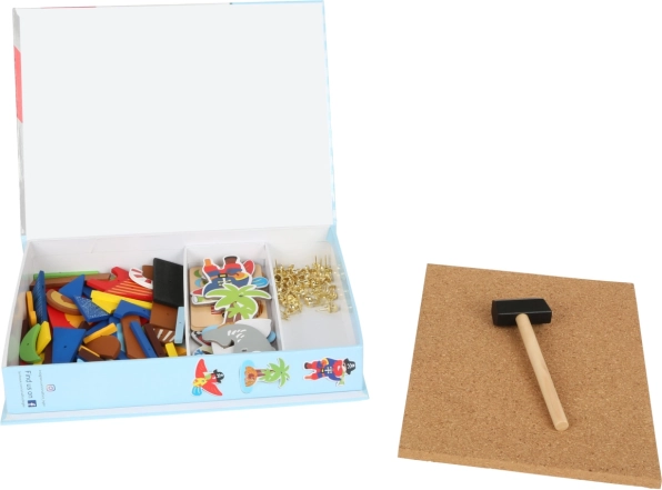 Dieses piratenstarke Nagelset von small foot ist die ideale Wahl für kreatives Spielen ab 6 Jahren. Bunte Holzteile mit Piratenmotiven lassen sich mithilfe der goldenen Reißnägel leicht in den elastischen Kork stecken und ergeben originelle „gehämmerte“ Bilder. Ebenfalls enthalten sind vier beidseitig bedruckte Vorlagenkarten, die Inspiration bieten und die Fantasie anregen.