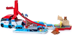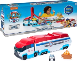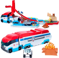 Verwandle dein Kinderzimmer mit dem imposanten 2-in-1-Transporter der PAW Patrol in eine Rettungszentrale. Der robuste weiß-blau-rote Truck mit getönten Fenstern entfaltet sich zu einer großzügigen Spielstation mit Rampe und Abschussvorrichtung, wo Kinder Fahrzeuge ins Rennen schicken, Feuer löschen, Fahrzeuge mit dem Lift hochfahren und einen zwischen Felsen eingeklemmten Bären retten.