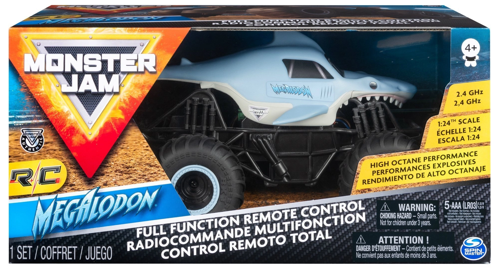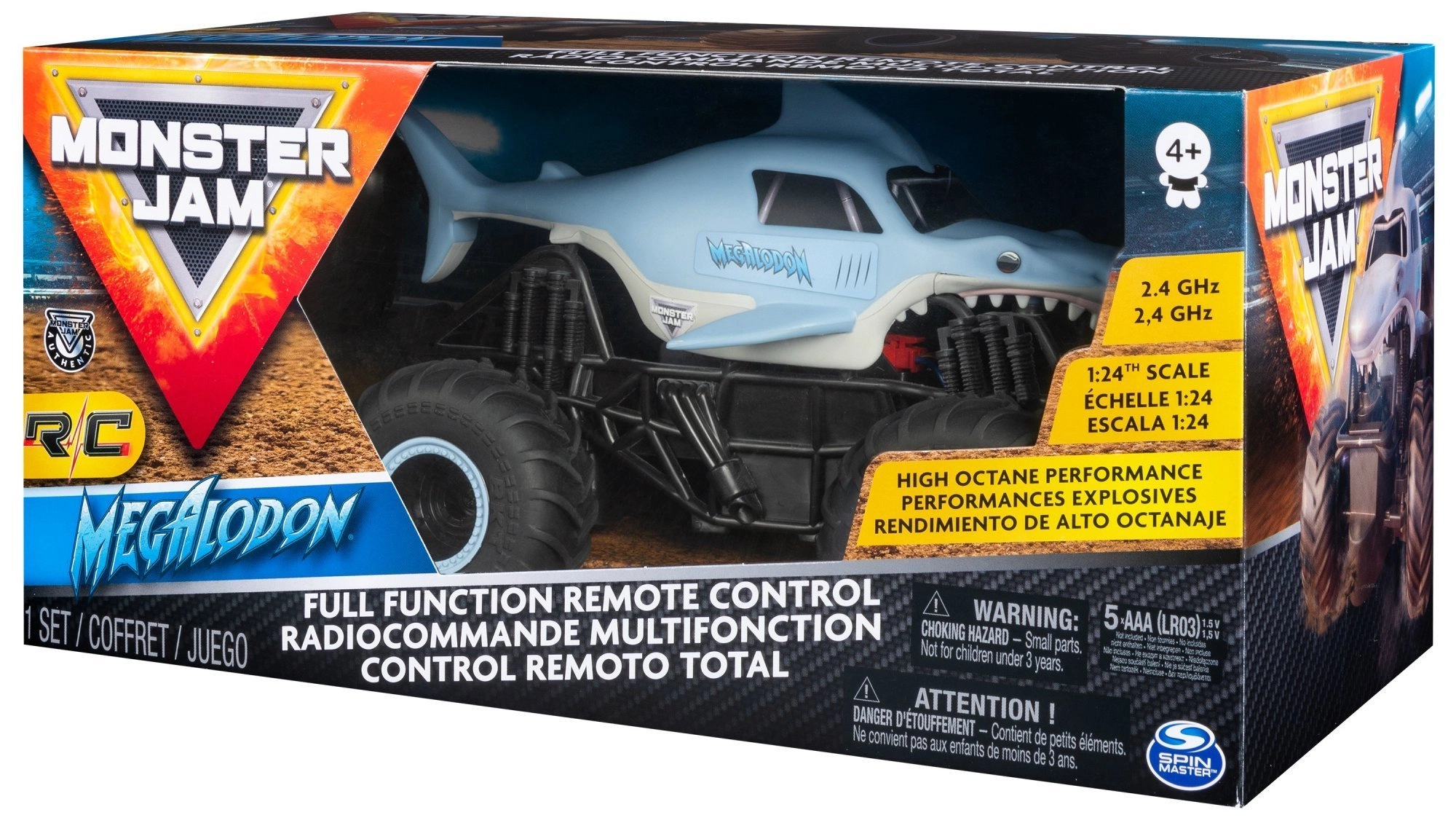 Das lizenzierte RC-Auto MONSTER JAM Megalodon bietet den authentischen Look des ikonischen Monstertrucks mit blauer Karosserie im Haifisch-Design, Flossen und Zähnen. Der Maßstab 1:24 ist ideal für Rennen zu Hause und die ersten RC-Erfahrungen.