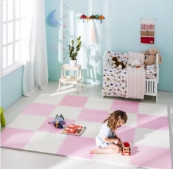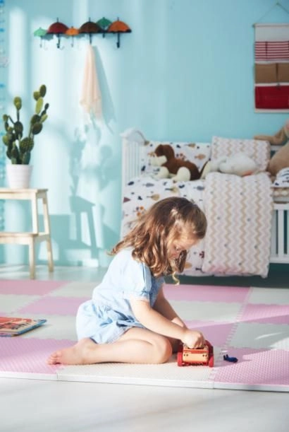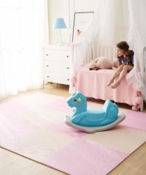 Die Matte ist wasserfest und leicht abwischbar – einfach mit einem feuchten Tuch reinigen. Anders als Teppiche nimmt sie weder Staub noch Milben auf und ist sanft zu empfindlicher Kinderhaut. Die neutrale, zarte Roséfarbe fügt sich in jedes Interieur ein.