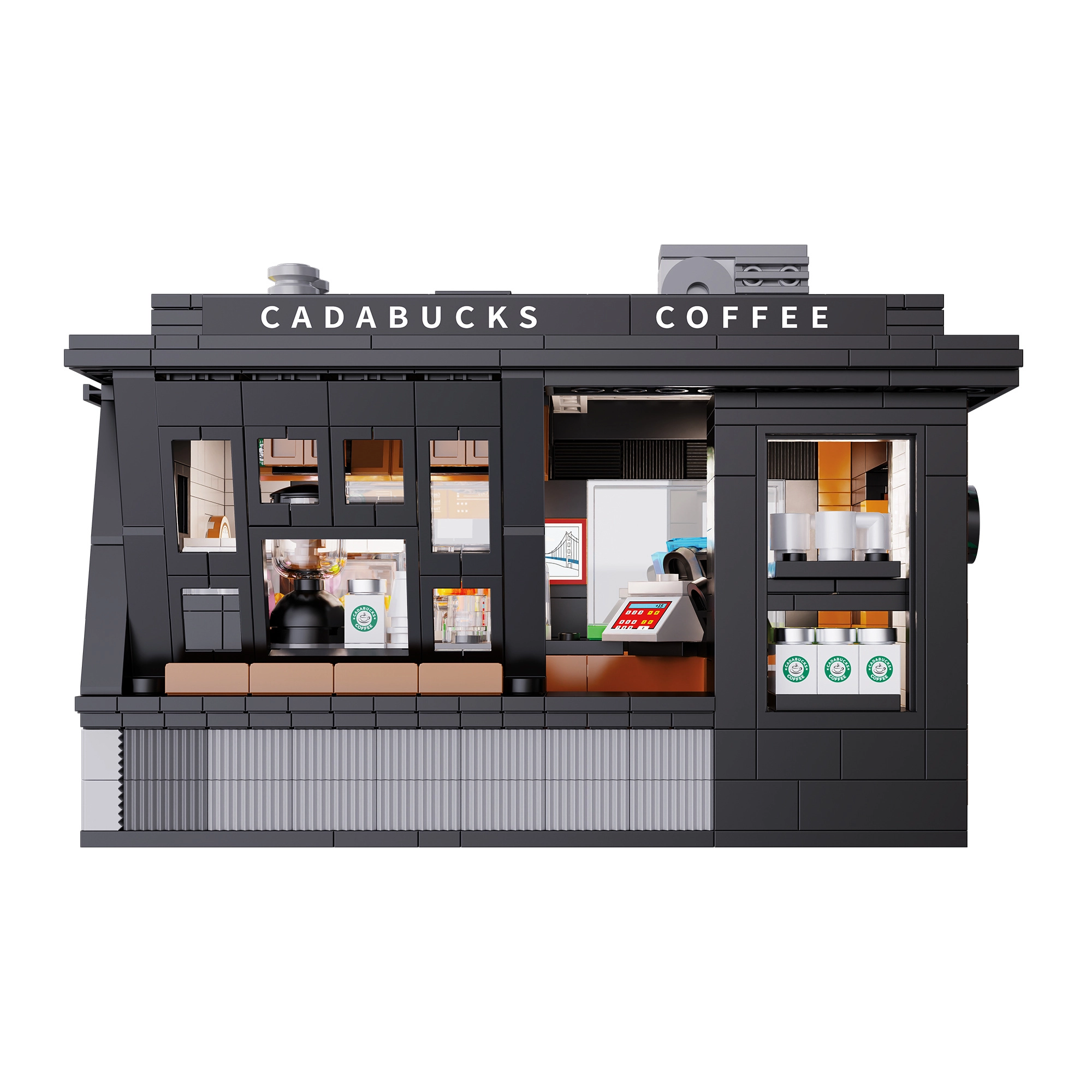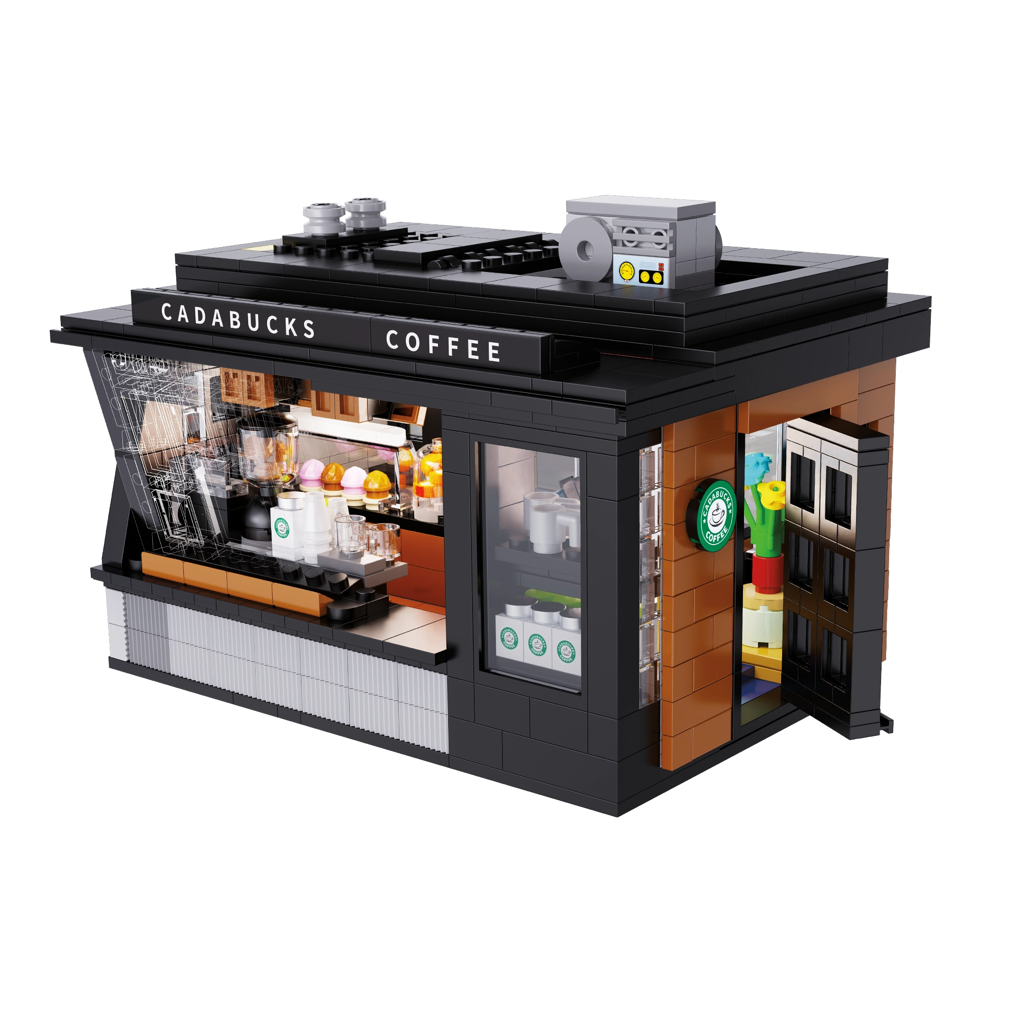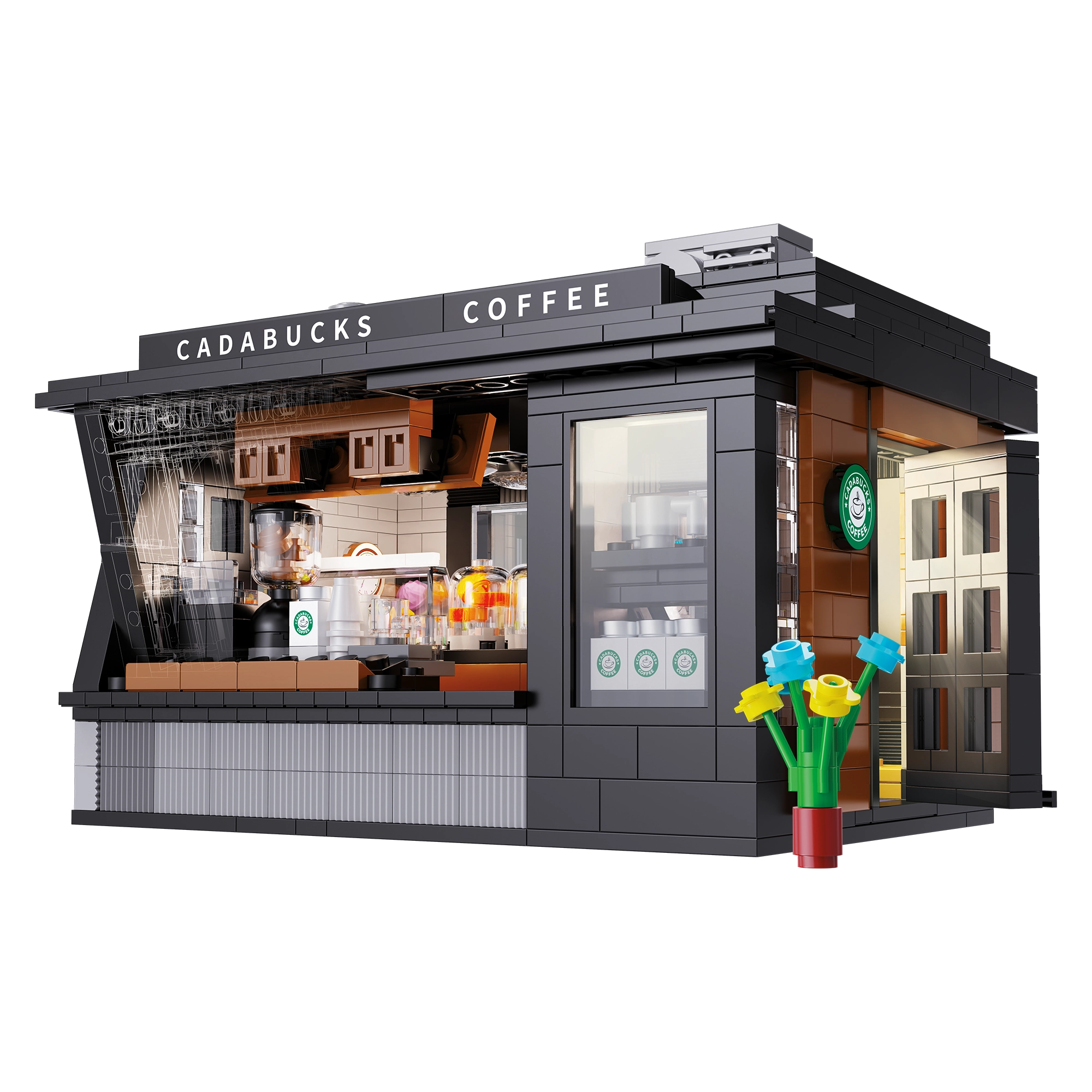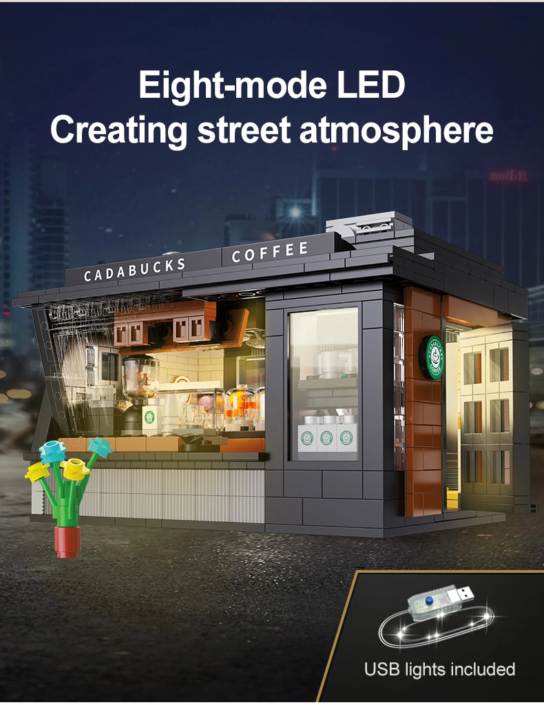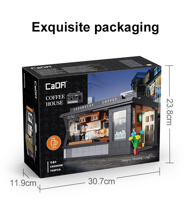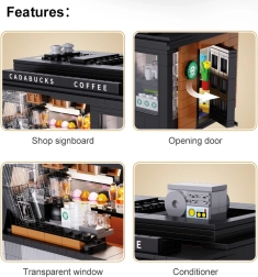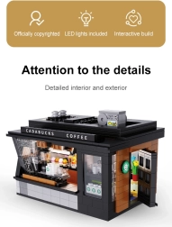 Baue dein eigenes Mini-Café mit dem Modell Cadabucks Coffee House der Marke CaDA. Das Set enthält 768 Teile, ein detailreiches Interieur für Barista- und Gästebereich sowie eine funktionale LED-Beleuchtung für authentische Atmosphäre. Eine abnehmbare Rückwand und das Dach sorgen für leichten Zugang ins Innere; Schaufenster, Schilder, Türen und viele realistische Accessoires sind ebenfalls enthalten.