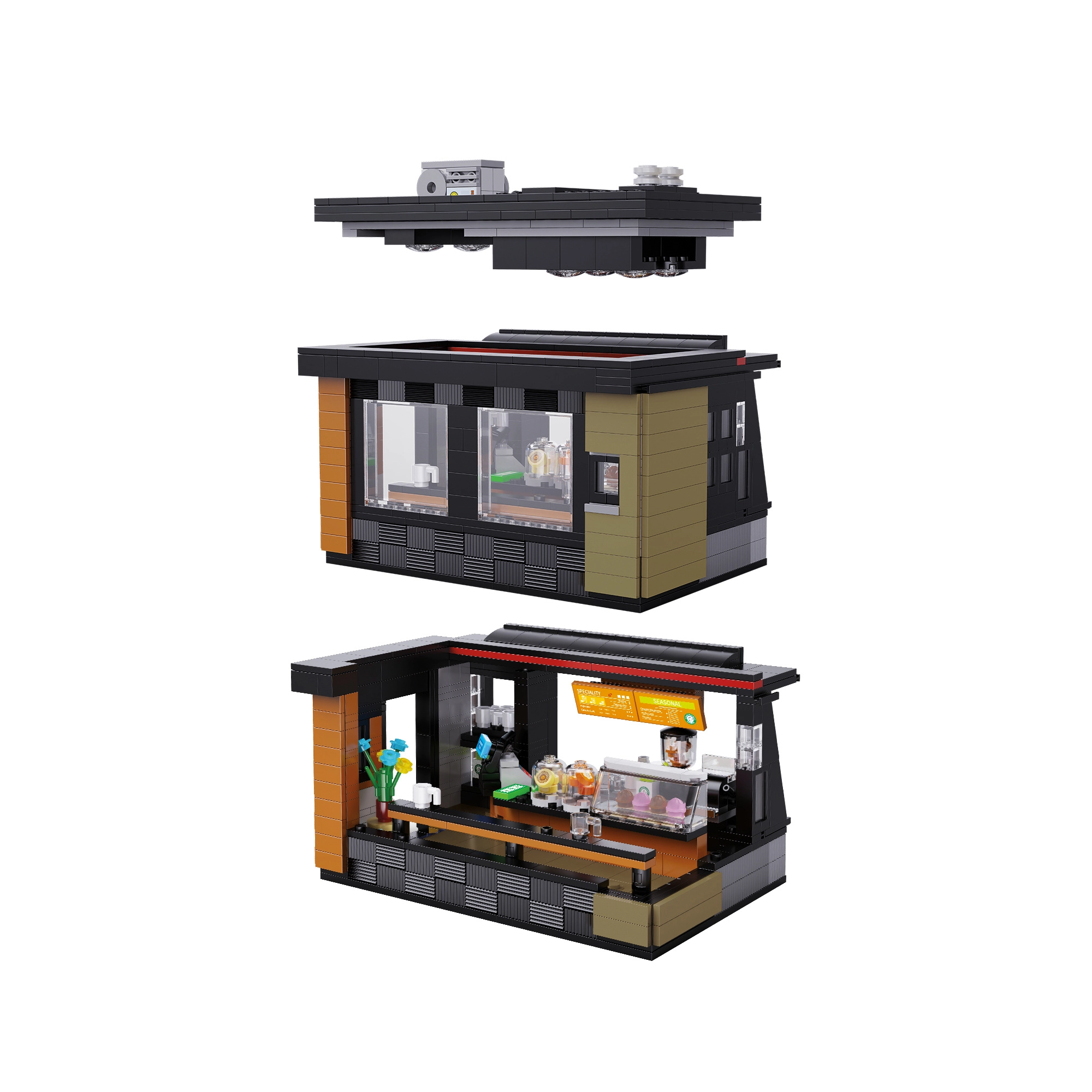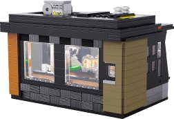 Gestalte ein stylisches Schaufenster und ein gemütliches Interieur mit Kaffeemaschine, Dessertvitrine, Tassen und Dekoration. Dank des USB-LED-Streifens erhält das Café am Abend wie auch tagsüber einen einzigartigen Café-Vibe. Die modulare Konstruktion mit abnehmbarem Dach und Rückwand erleichtert Spielen und Ausstellen im Regal.