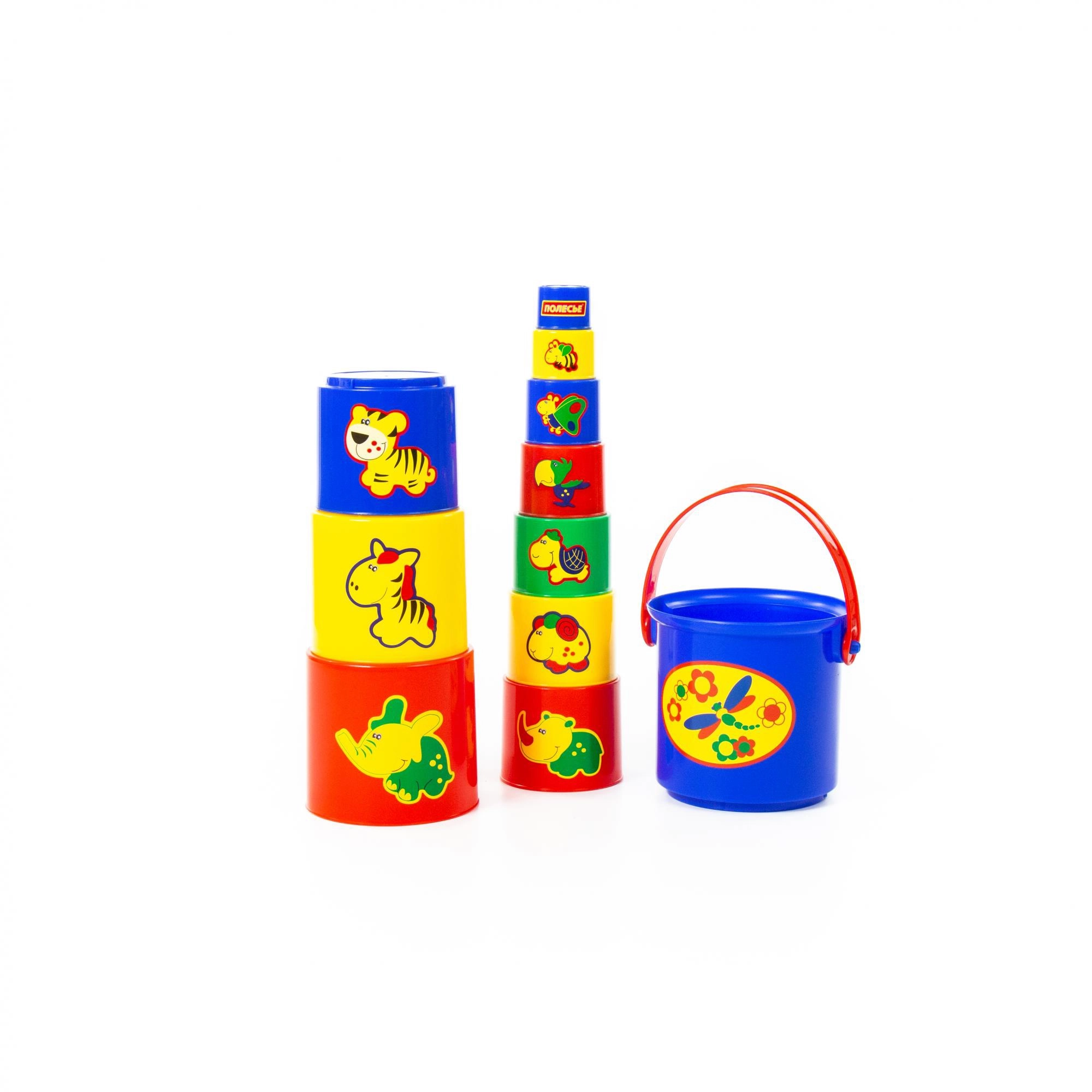 Alles ist praktisch in einem Eimer mit 14 cm Durchmesser verstaut, sodass sich das Spielzeug leicht transportieren und aufräumen lässt. Kräftige Farben und Tierillustrationen unterstützen das Erkennen von Farben und das Lernen von Größen – vom kleinsten bis zum größten Teil.
