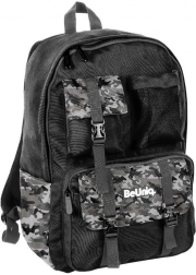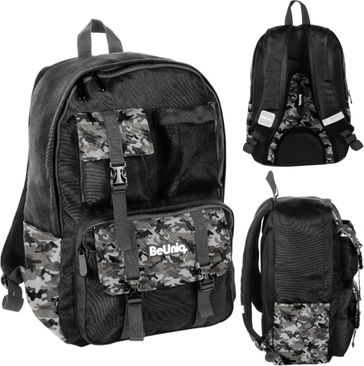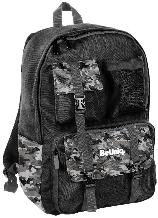 Suchen Sie einen zuverlässigen Schulrucksack für jeden Tag? BeUniq Moro vereint modernes Tarn-Design und Funktionalität: eine große Kammer für Bücher und A4-Hefte, drei vordere Reißverschlusstaschen für Kleinigkeiten und zwei seitliche Materialtaschen für Flaschen. Gepolsterter, anatomisch geformter Rücken mit atmungsaktivem Mesh und bequeme, verstellbare Schultergurte sorgen auch bei voller Beladung für Komfort.