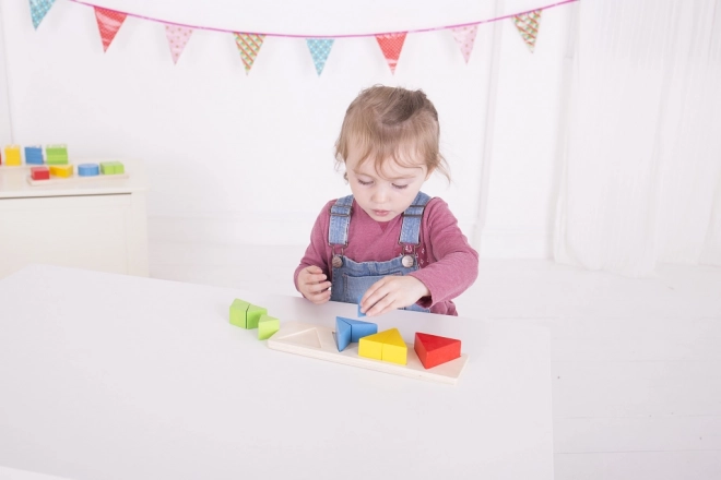 Einfache Formen und klare Farben (Rot, Blau, Grün, Gelb) fördern die visuelle Wahrnehmung und das logische Sortieren. Das Einsetzen in die passenden Positionen stärkt das richtige Zuordnen.