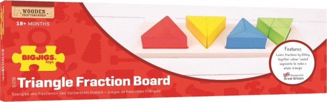 Vier farbige Sets aus Dreiecken auf einer Holzgrundplatte führen Kinder an das Prinzip von Teil und Ganzem heran. Ideal für die erste Begegnung mit Brüchen – ganz ohne Druck.