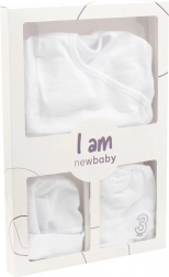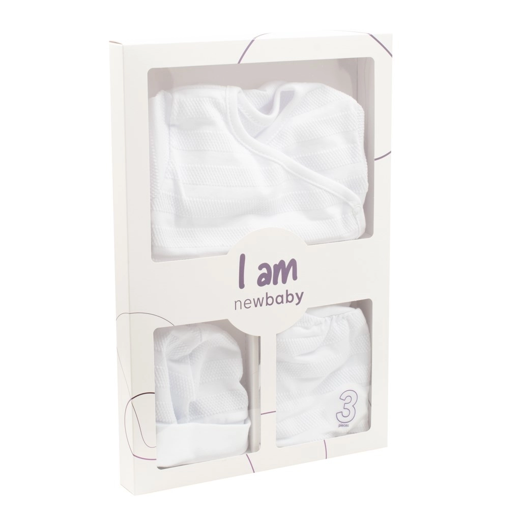 Dieses Neugeborenen-Set NEW BABY I AM wurde mit Blick auf die empfindliche Haut von Babys entwickelt. Die sanfte und atmungsaktive Baumwolle sorgt für ganztägigen Komfort, während praktische Details das tägliche Wickeln und Anziehen erleichtern. Die neutrale weiße Farbe und das klare Design eignen sich für Mädchen und Jungen.