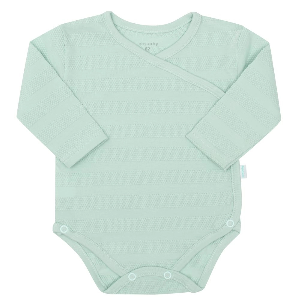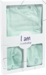 Die Schlupfhosen haben einen breiteren, elastischen Bund, der nicht auf das Bäuchlein drückt, sowie integrierte Füßchen für dauerhafte Wärme und Schutz. Das Mützchen mit breiterem Saum sitzt fest, aber sanft, rutscht nicht und drückt nicht. Der gesamte Set wird durch die attraktive Materialstruktur in modernem Mint betont und kommt in einer ökologischen Geschenkbox – ideal als liebevolles Geschenk für Neugeborene.