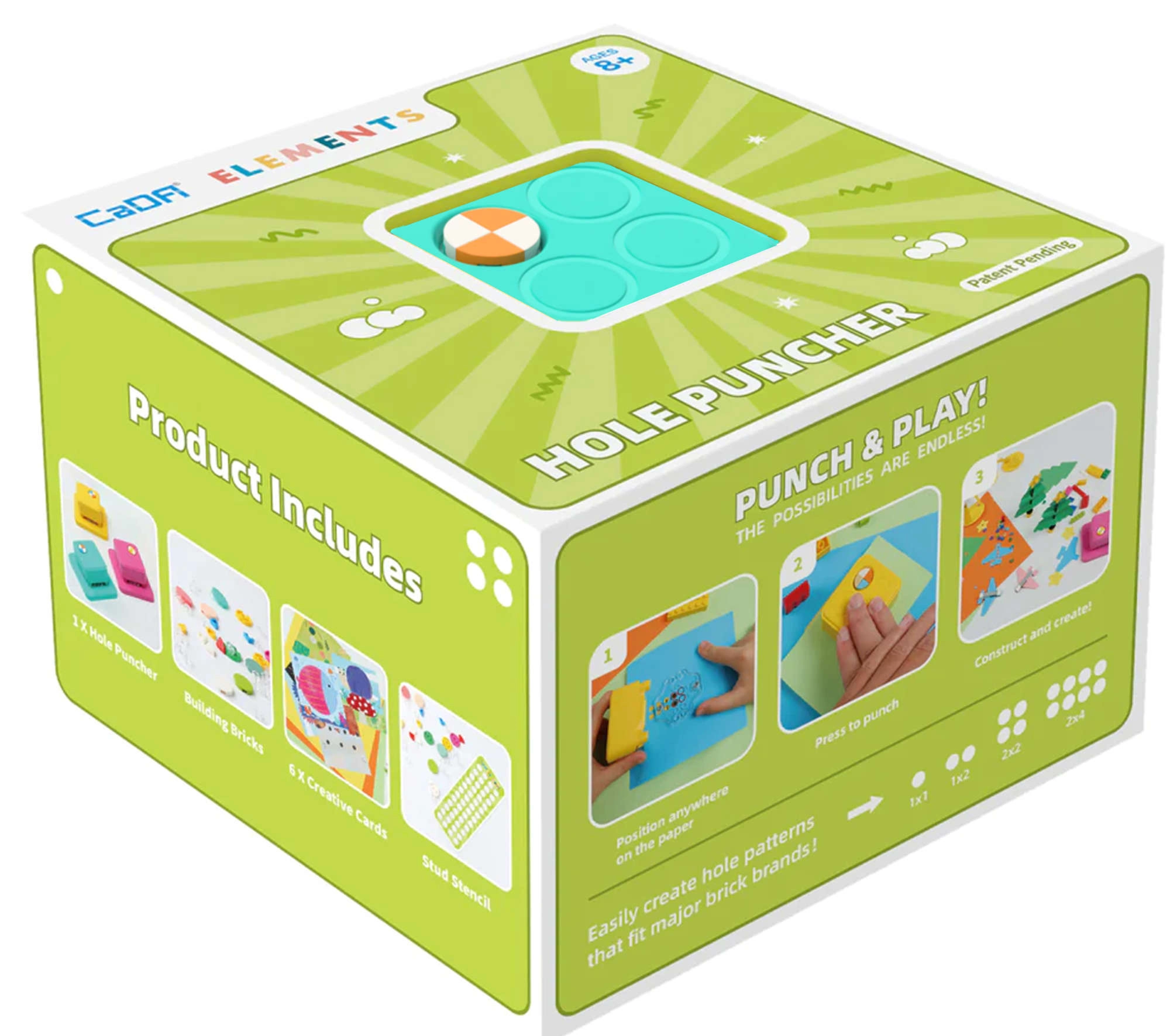 Im Set ist alles für den sofortigen Start enthalten: Locher mit Unterlage, 99 Bausteine, 2 Schablonen mit Löchern und 6 Zierkarten. Das Set ist mit weiteren CADA-Sets kompatibel, sodass Sie es leicht erweitern und die Kreativität noch weiter ausbauen können.
