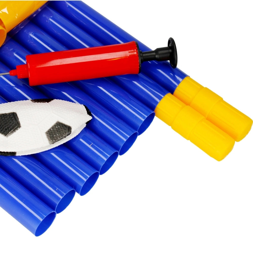 Das Set wird als Komplettpaket geliefert: Tor aus Verbindungsrohren, Netz, Ball und Handpumpe. Die Heringe sorgen für Standfestigkeit des Tores auf Rasen, während das robuste Netz jeden Treffer zuverlässig auffängt. Perfekt zur Förderung von Koordination, Bewegung und Teamspiel.
