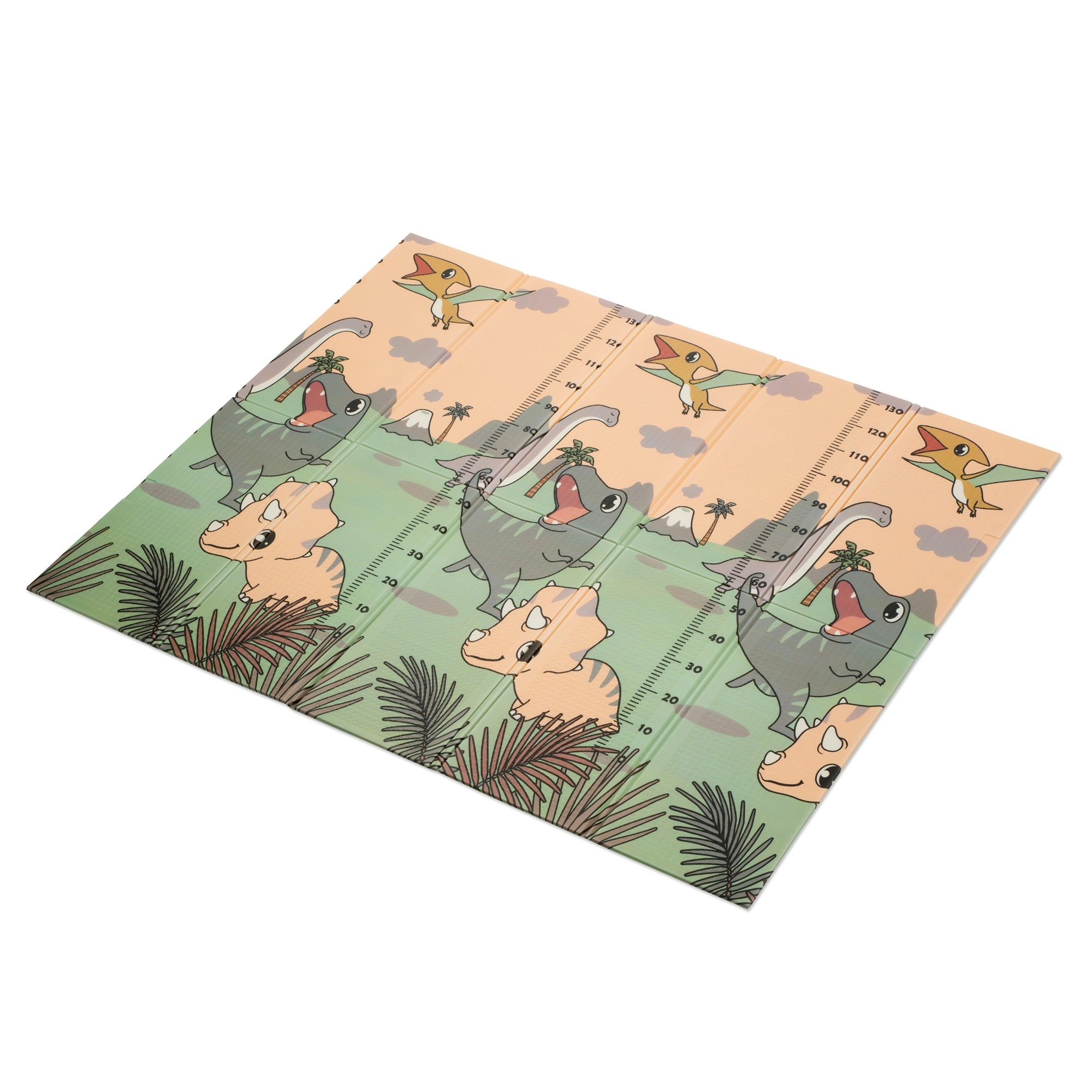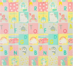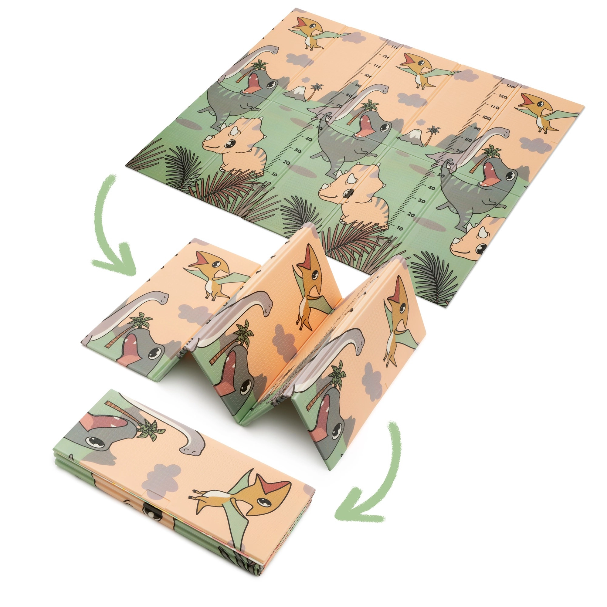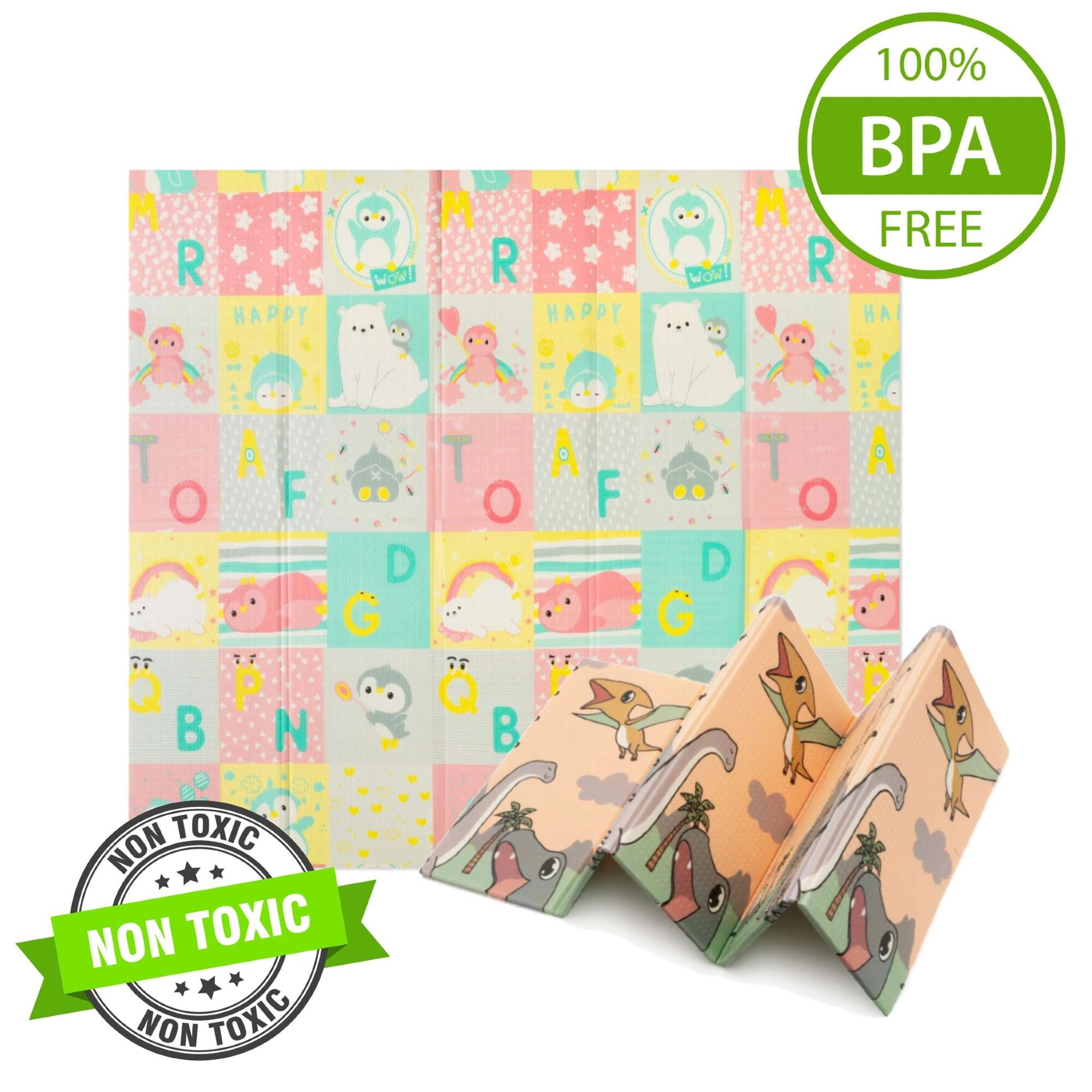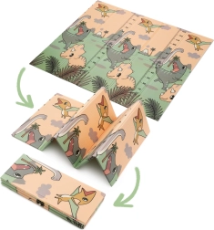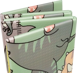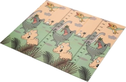 Beide Seiten bieten einen pädagogischen Druck in sanften Pastellfarben: niedliche Dinosaurier mit Höhenmessskala sowie ein Motiv mit Tieren und Buchstaben. Die rutschfeste Prägung unterstützt das sichere Erlernen von Krabbeln und Laufen und fördert gleichzeitig die sensorische Entwicklung. Die Oberfläche ist wasserabweisend und lässt sich einfach mit einem feuchten Tuch abwischen.