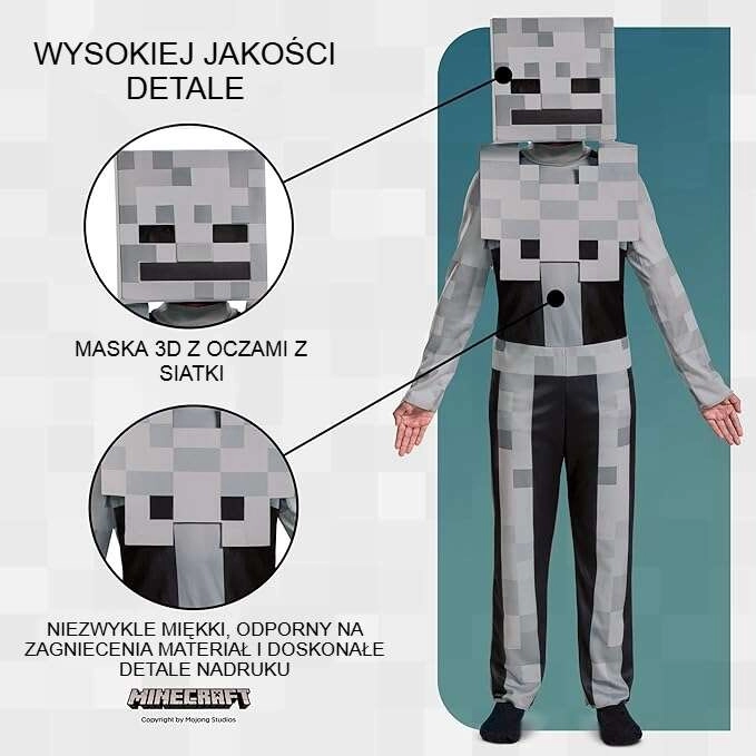 Das grau‑weiße Kostüm mit kachelartigem Aufdruck erinnert originalgetreu an das Skelett aus MINECRAFT und sorgt für einen auffälligen Auftritt bei jedem Event.
