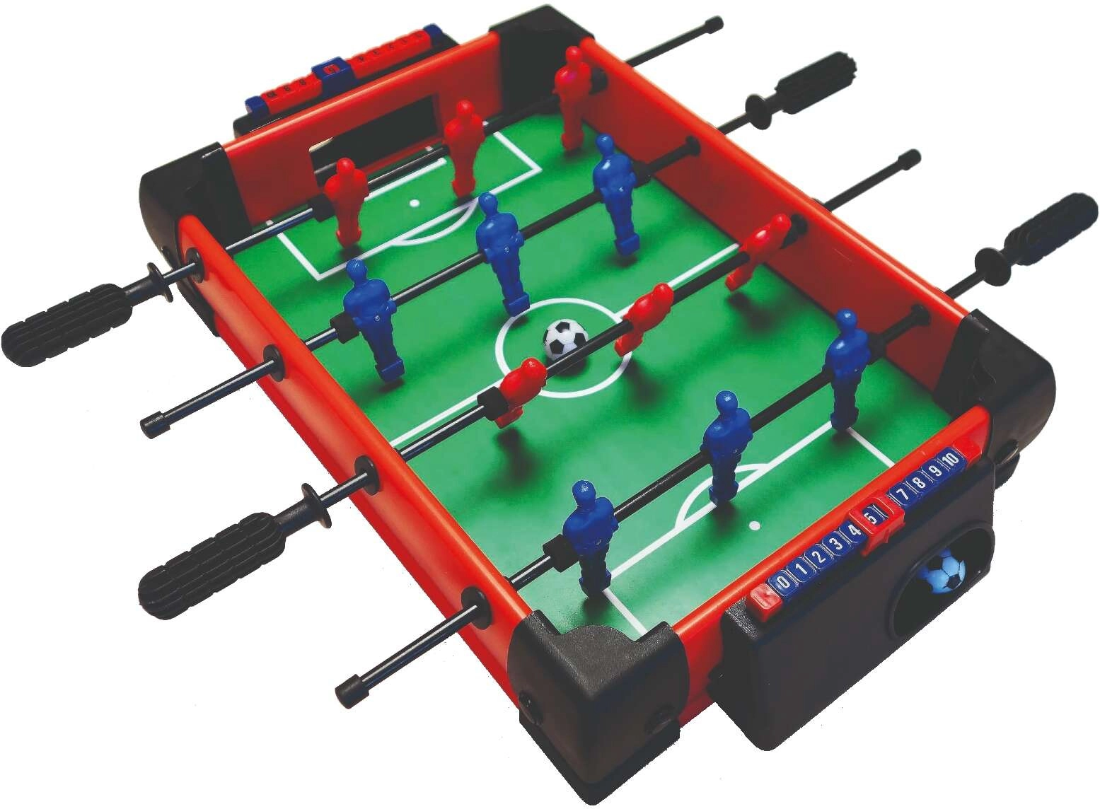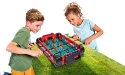 Dank der kompakten Maße von 50 × 30 cm passt der Kicker auf den Tisch im Kinderzimmer oder ins Wohnzimmer. 12 Spieler auf den Stangen und 2 verschiebbare Torhüter ermöglichen ein schnelles Spiel, wobei sich die Griffe um 360° drehen lassen – für präzise Schüsse und Pässe. Der Punktezähler behält das Ergebnis jedes Spiels im Blick.
