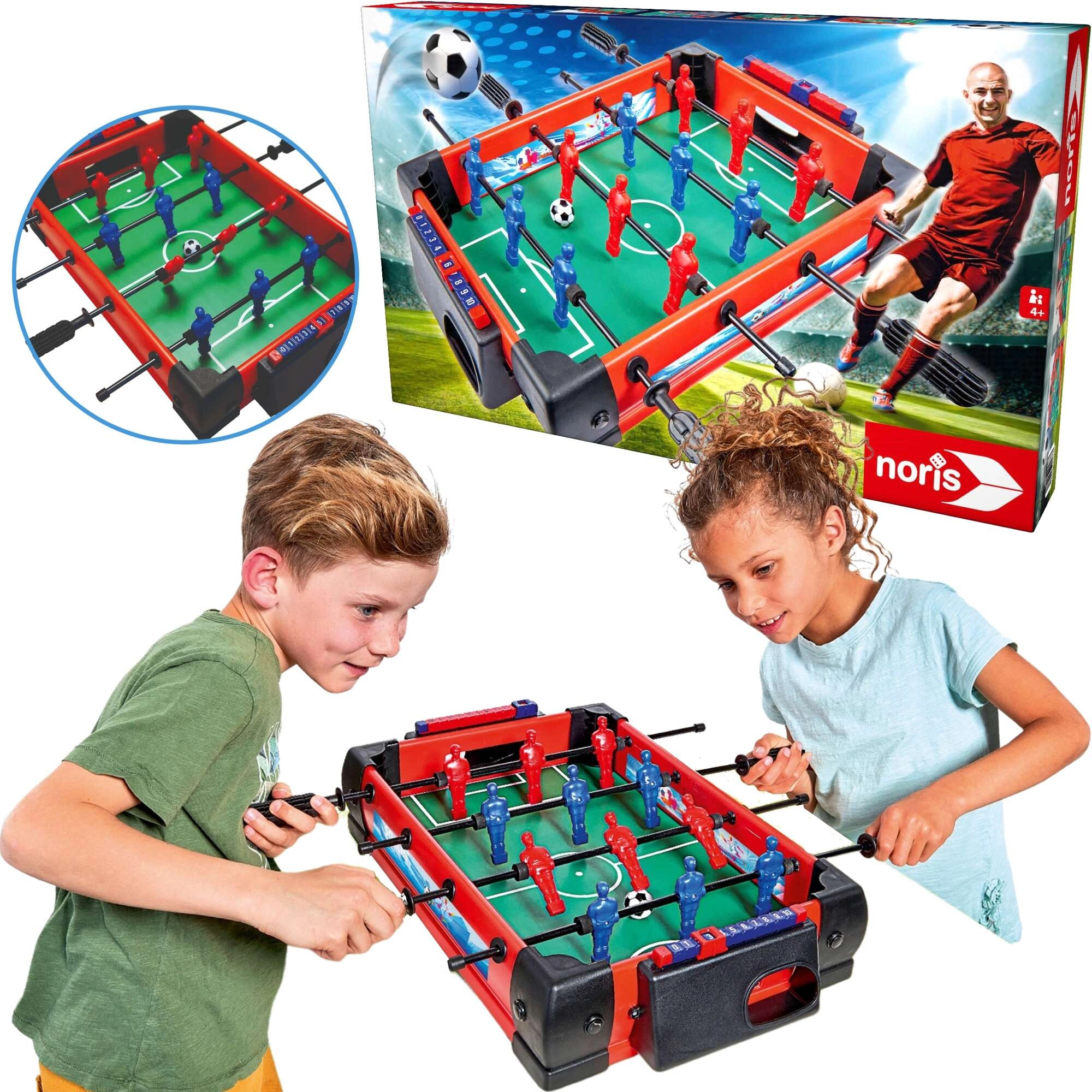 Genießen Sie dynamische Duelle zu Hause mit dem Tischkicker von NORIS. Das stabile rote Gehäuse mit grünem „Rasen“ erinnert an ein kleines Stadion und bietet einen flüssigen Lauf der Stangen sowie eine komfortable Bedienung für Kinder und Erwachsene. Eine perfekte Wahl zur Förderung von Motorik, Hand-Auge-Koordination und Teamgeist.
