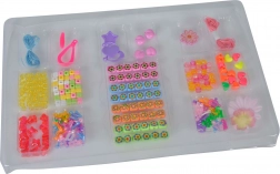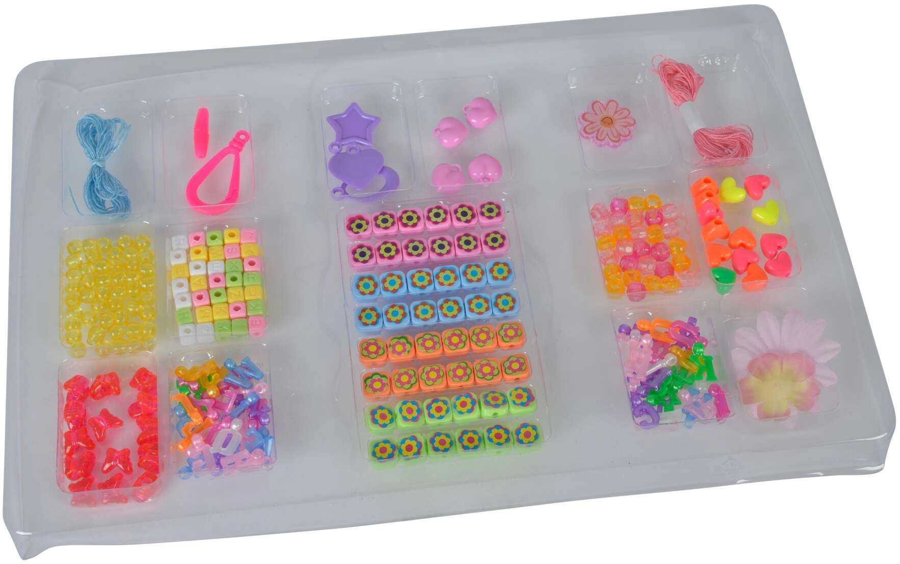 Dieses umfangreiche Set für kleine Designerinnen und Designer bietet alles, was man zur Herstellung individueller Schmuckstücke benötigt. Kinder können Namen aus Buchstabenwürfeln legen, runde und geformte Perlen kombinieren und sie mit dekorativen Blüten und Anhängern ergänzen. Man braucht nur eine Schere zum Kürzen der Schnur und etwas Fantasie.