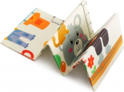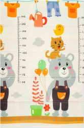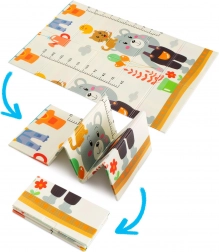 Eine Seite bietet fröhliche Tiermotive mit Höhenmessskala, die andere bunte Straßen und Gebäude zur Förderung der Fantasie und der sensorischen Wahrnehmung.