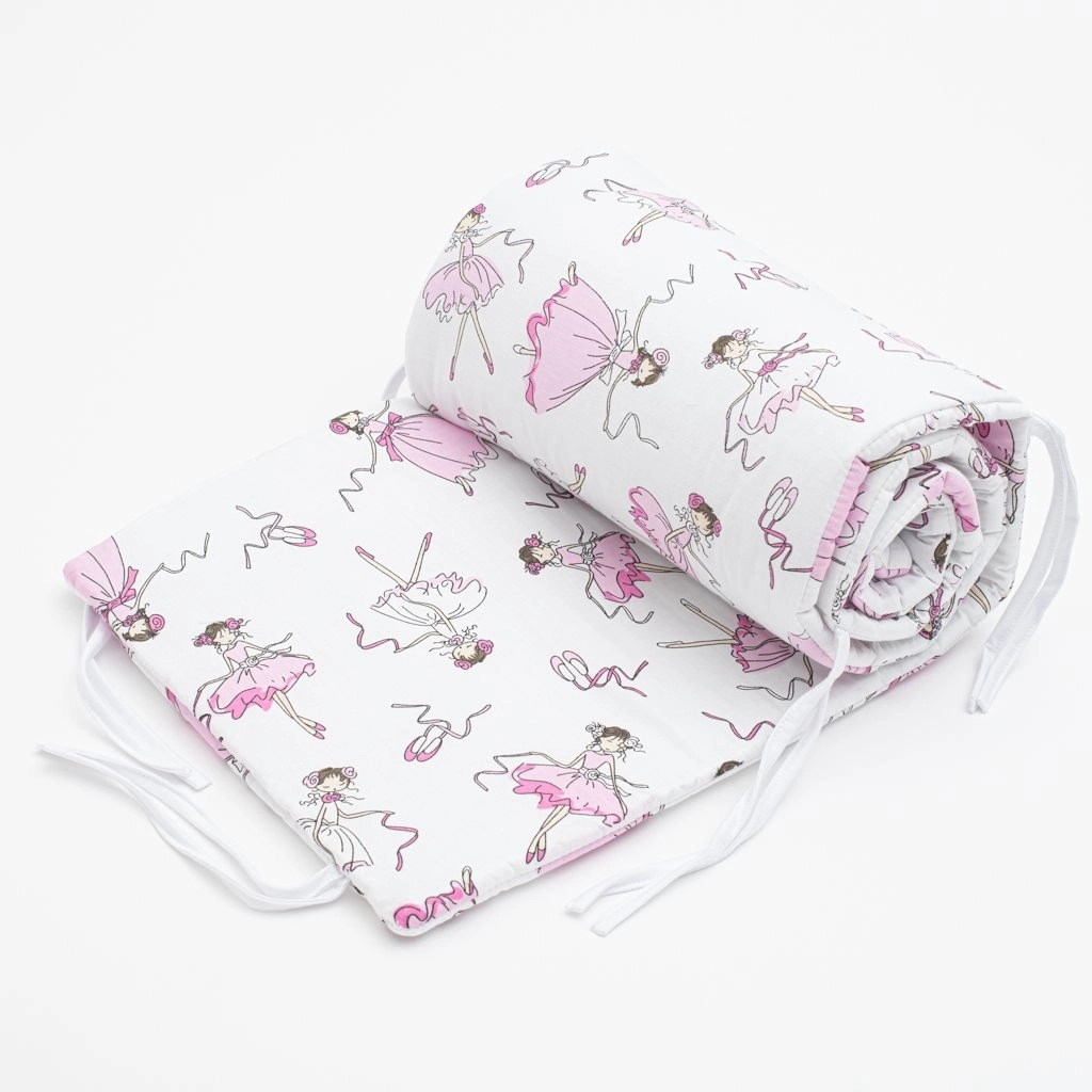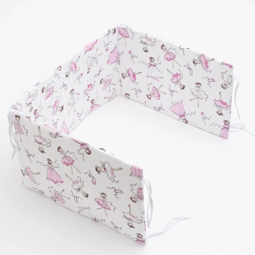 Praktische Bettumrandung mit Ballerina-Motiv sorgt bei Ihrem Baby für Sicherheit und Komfort. Hergestellt aus weicher 100% Baumwolle mit hypoallergener Füllung aus Polyester, wird sie mittels stabiler Bänder am Bettchen befestigt und schützt vor Stößen und Zugluft. Größe ca. 150 cm.