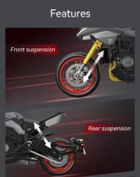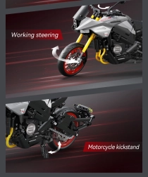 Dank der beweglichen Elemente genießen Sie sowohl den Bau als auch die Präsentation: Das Modell verfügt über einen drehbaren Lenker, einen transparenten Motor mit beweglichen Kolben, der mit dem Hinterrad verbunden ist, eine arbeitende Kette, ein Dreigang-Getriebe, eine funktionierende Federung und einen verstellbaren Ständer. Nicht fehlen dürfen Scheinwerfer, Spiegel, Armaturenbrett, Bremsscheiben und präzise geformte Verkleidungen.