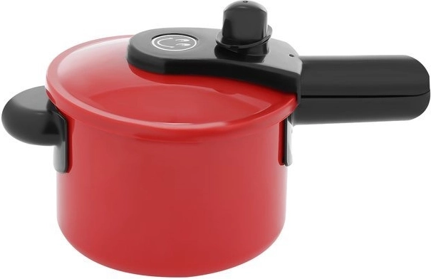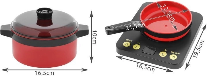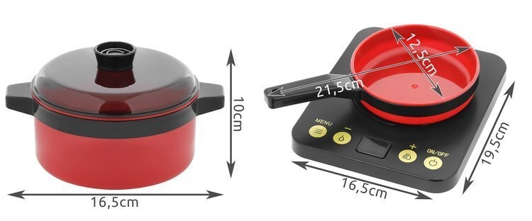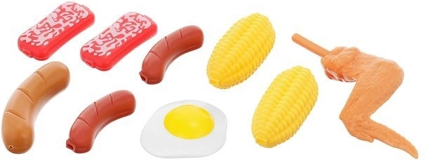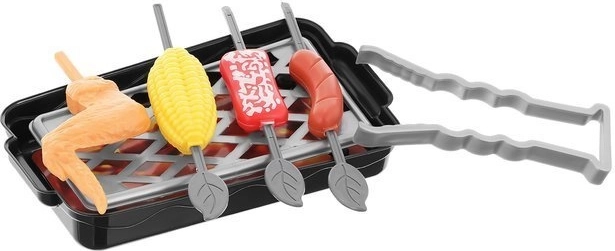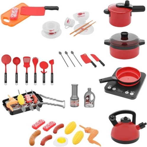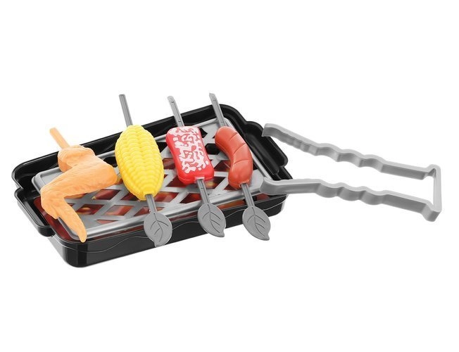 Im Set finden Sie unter anderem einen Grill mit Rost, einen Induktionskocher, einen Schnellkochtopf und Topf, eine Pfanne, einen Wasserkocher, ein Schneidebrett und sichere Messer, Utensilien (Schöpflöffel, Spachtel, Zange), Geschirr (Schüsseln, Teller, Becher) sowie „Lebensmittel“ und Gewürze für ein realistisches Spiel.