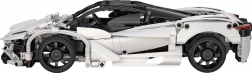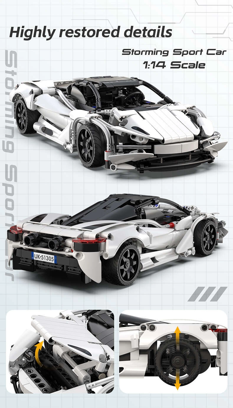 Detailreiche weiße Karosserie mit schwarzen Akzenten, öffnende Motorhaube und Gummiräder für sicheren Grip. Tolle Optik und Funktion.