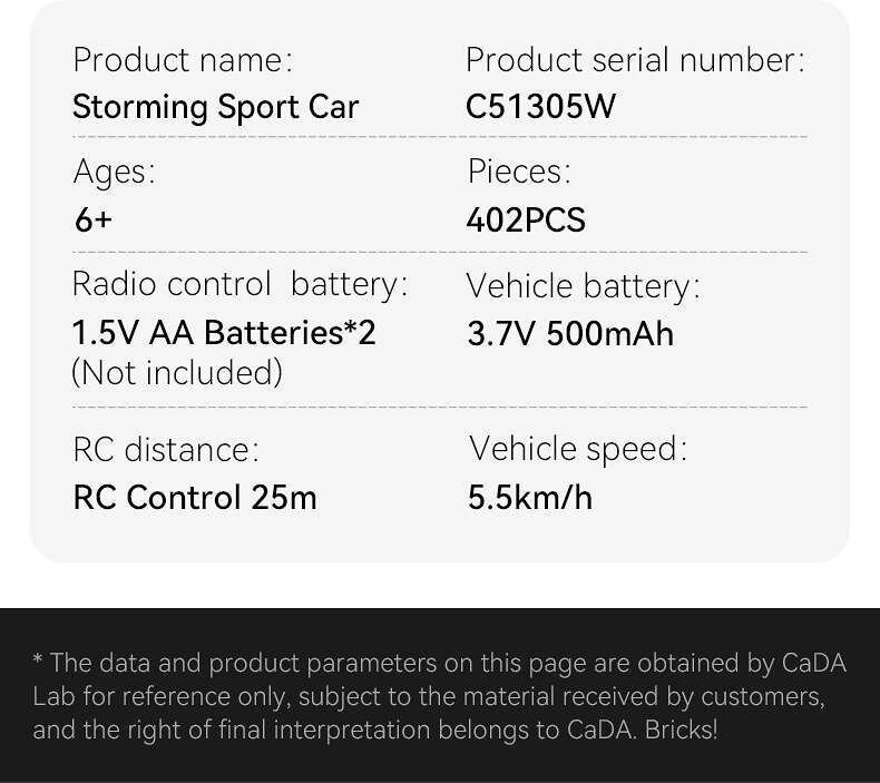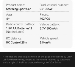 Der CaDA-Sportwagen überzeugt mit realistischen Proportionen, robuster Konstruktion und einer attraktiven weißen Karosserie mit schwarzen Elementen. Dank Antrieben und präziser Lenkung genießen Sie sanftes Vor- und Rückwärtsfahren sowie exaktes Kurvennehmen. Dual Mode erlaubt die Steuerung per klassischer Fernbedienung oder via Smartphone mit Bluetooth – Spaß drinnen und draußen.