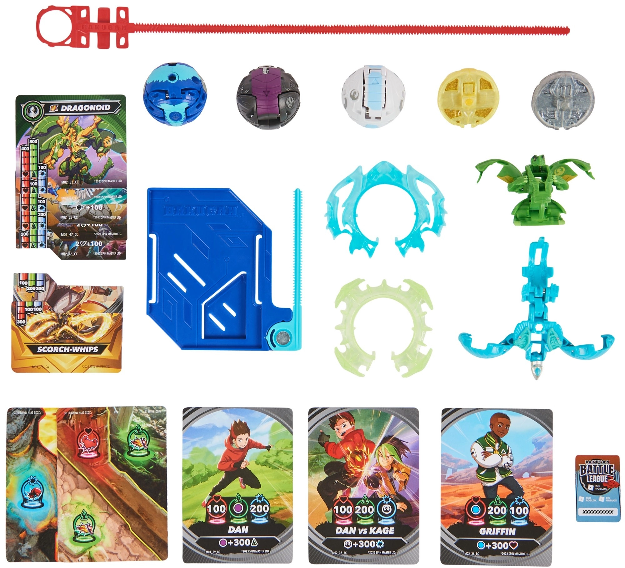 Im Set enthalten sind Bakugan-Kugeln, Teile für Special Attack, Kämpfer- und Fähigkeitskarten, Gate-Karten sowie ein Aufbewahrungsmagazin – alles für den sofortigen Spielstart.