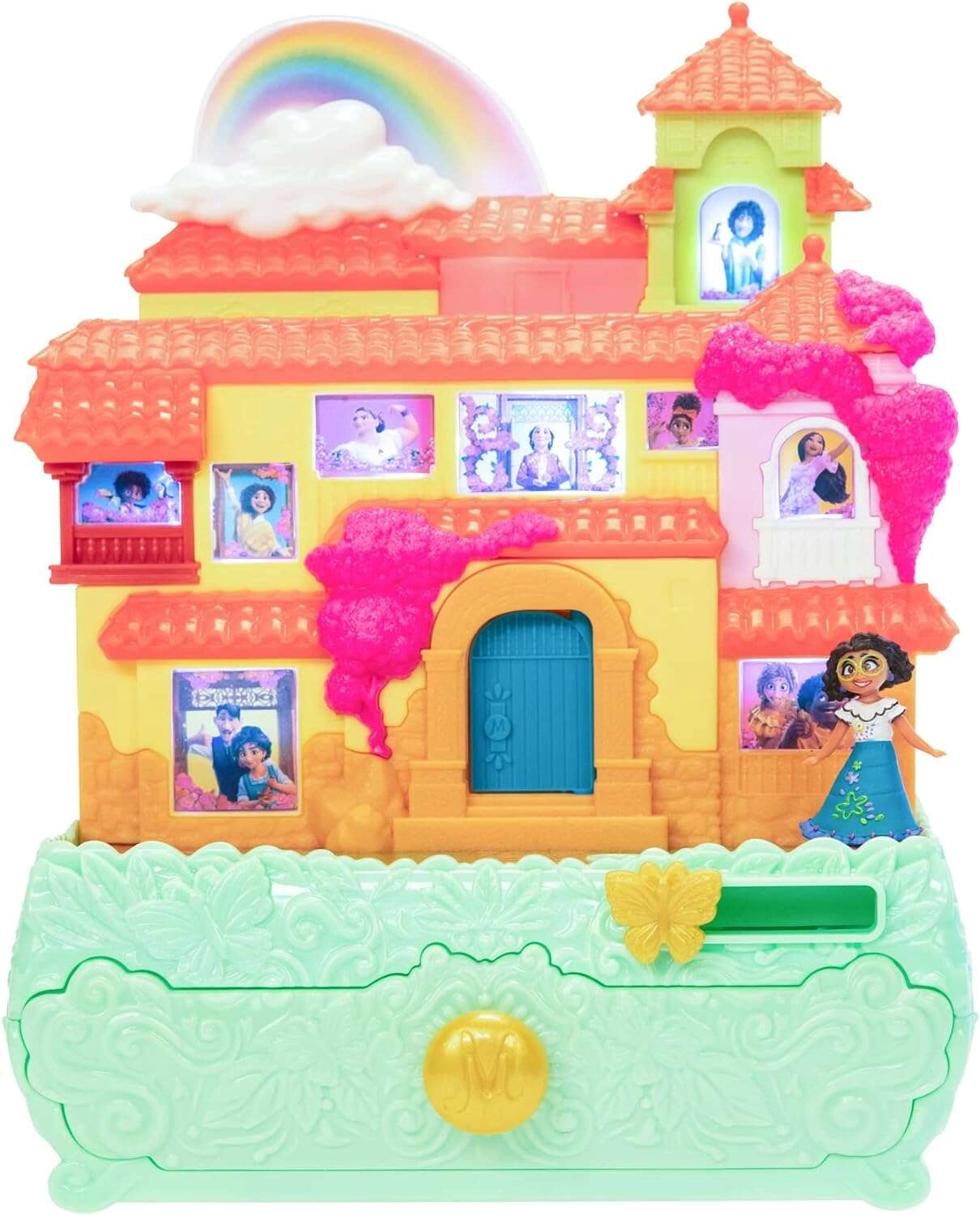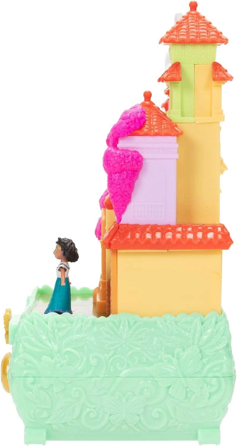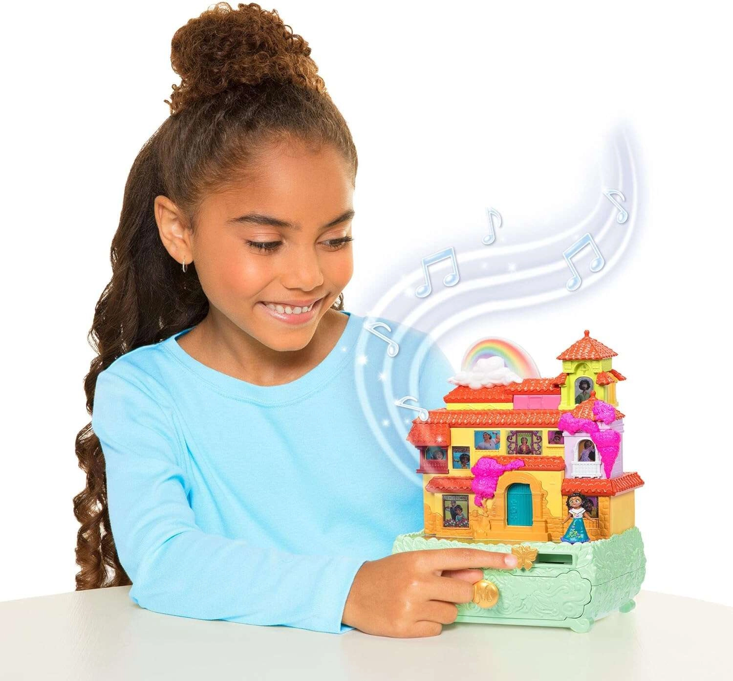 Leuchtende Fenster, öffnende Türen und eine tanzende Mirabel erwecken eine Szene aus ENCANTO zum Leben. Einfach den Schmetterling schieben und das Haus spielt beliebte Melodien.