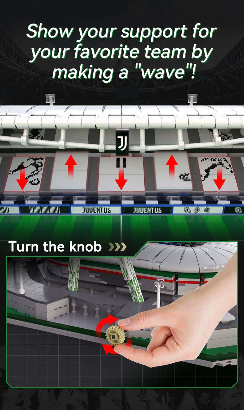 Das Modell ist in sechs Module unterteilt (Spielfeld, vier Tribünen und Dach), sodass Sie es leicht zerlegen und das Innere betrachten können. Die einzigartige „Welle“-Funktion lässt sich über einen Drehregler steuern und bewegt die Sitze nach oben und unten – genau wie in einem echten Stadion. Dank durchdachtem Design und robuster Bauweise ist es ideal zum Bauen, Ausstellen und für Sammler.