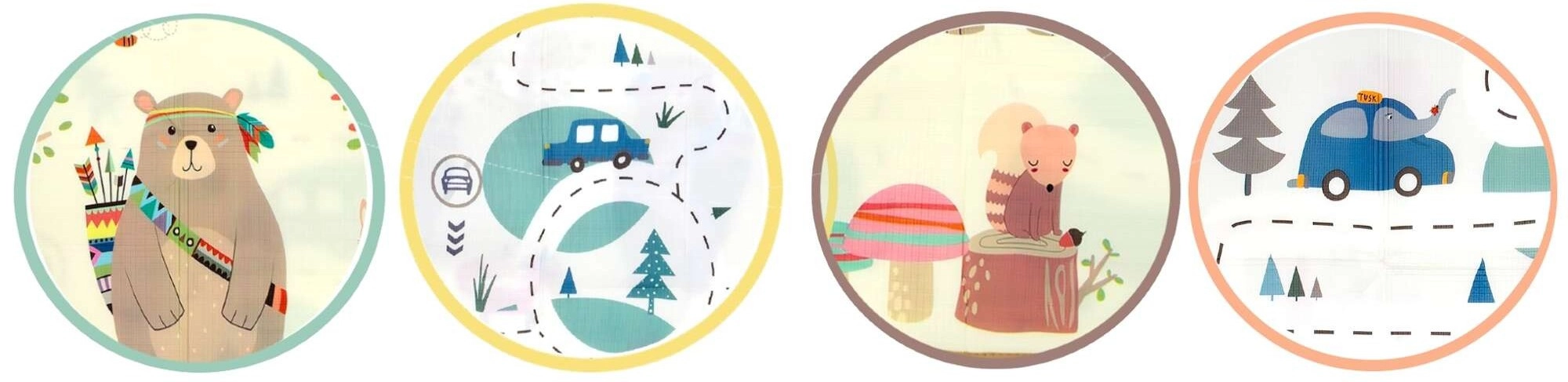 Eine Seite mit niedlichen Tieren fürs Kinderzimmer, die andere mit Straße und Autos für Spielspaß mit Spielzeugautos. Passt sich leicht an Einrichtung und Stimmung des Kindes an.