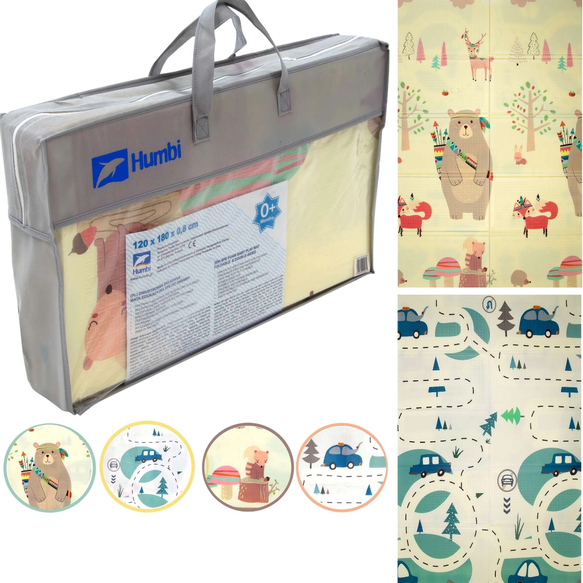 Die HUMBI-Matte bietet Kindern einen weichen und sicheren Platz zum Spielen, Ausruhen und zur motorischen Entwicklung. Der hochwertige XPE-Schaum ist formstabil, absorbiert Stöße und isoliert hervorragend gegen Bodenkälte. Das beidseitige Design bietet auf der einen Seite niedliche Waldmotive (Bären, Füchse, Igel) und auf der anderen Seite eine Straße mit Autos für spaßige Fahrten der Spielzeugautos und sensorische Entdeckungen.