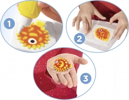 Ideal zur Förderung von Kreativität, Feinmotorik und Vorstellungskraft. Dank der leicht zu drückenden Fläschchen, leuchtenden Farben und wiederverwendbaren Formen ist das Gestalten intuitiv und macht Spaß. Die große Unterlage mit Jahrmarkt-Motiv bietet Platz für das Wasserbecken, das Ablegen der Gele und fertigen Werke.
