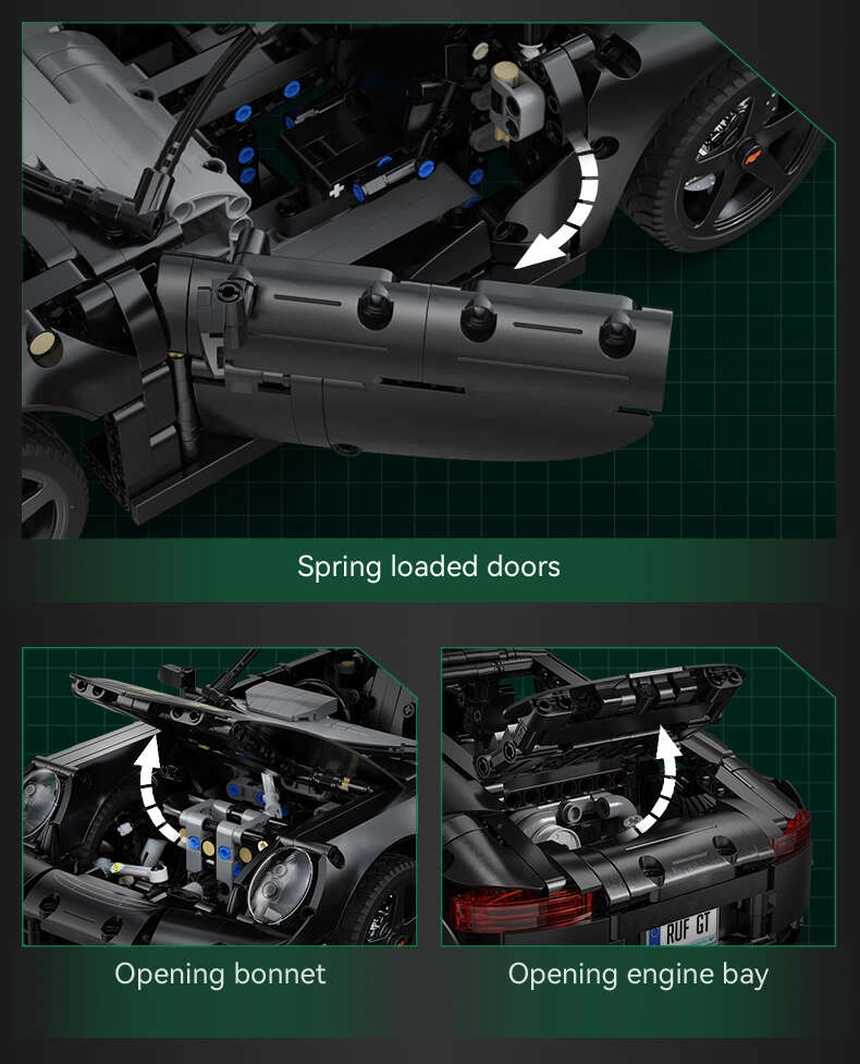 Das CaDA-Bauset aus der Reihe „Make Your Bricks Move“ begeistert anspruchsvolle Fans technischer Modelle. Das präzise ausgearbeitete Modell RUF GT verbindet realistische Funktionen mit ansprechendem Design: öffnende Elemente, Lenkung, Federung und ein detailliertes Interieur. Im Maßstab 1:10 überzeugt es sowohl als Sammlerstück als auch als actionreiches Spielmodell.