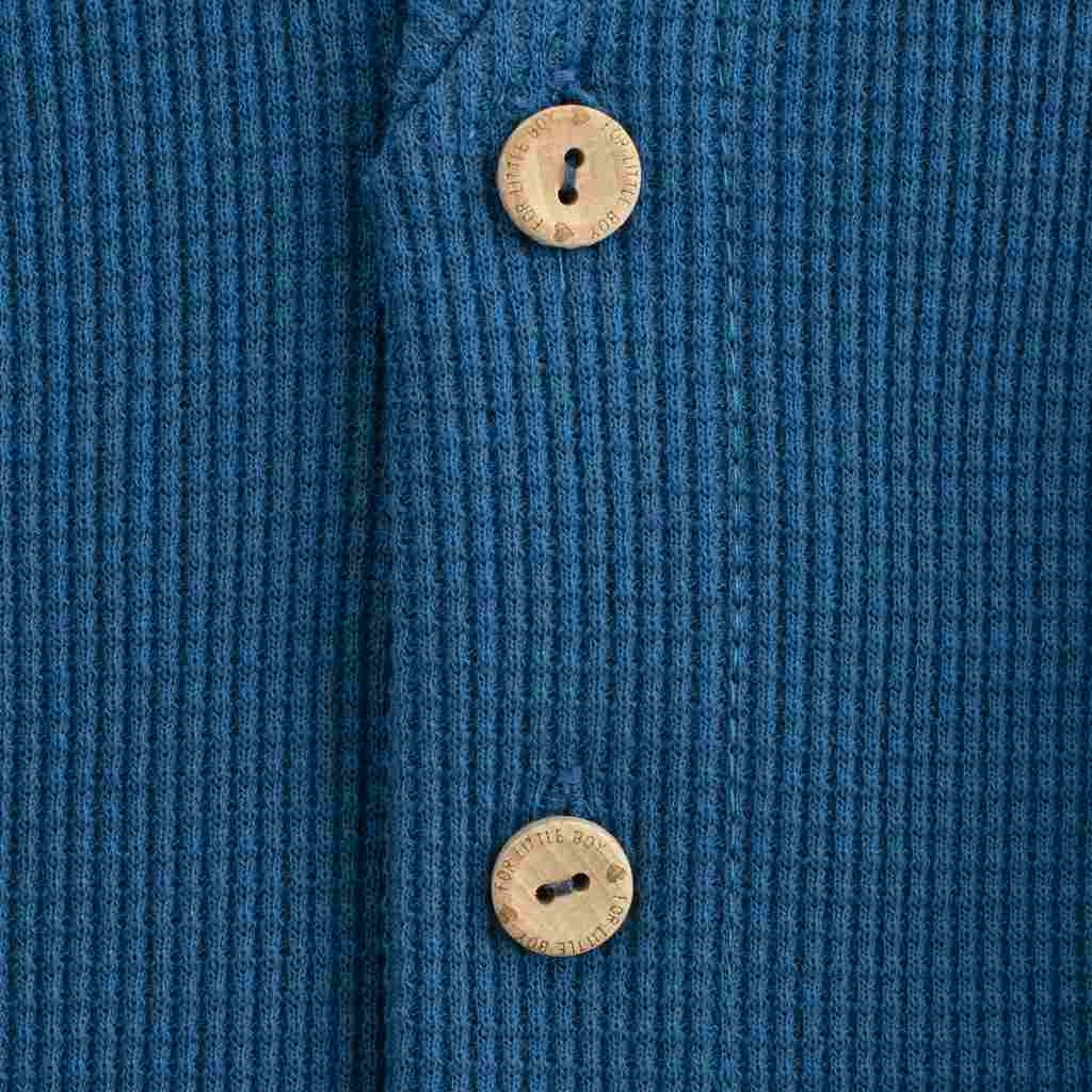 Elegantes Baby-Jäckchen New Baby Oliver mit V-Ausschnitt und praktischer Knopfleiste. Holzknöpfe verleihen dem Jäckchen ein stilvolles und elegantes Aussehen. Dank des hochwertigen Materials ist es für ganztägiges Tragen bequem und ersetzt im Kleiderschrank kleiner Jungen hervorragend einen Pullover.