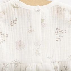 Der Musselin aus 100 % Baumwolle ist nicht nur außerordentlich angenehm, sondern auch strapazierfähig – mit jedem Waschgang wird er noch weicher und behält dennoch seine Form. Der rückseitige Druckknopfverschluss erleichtert das schnelle Umziehen, sodass das Kleid perfekt für den Alltag und sommerliche Ausflüge geeignet ist.