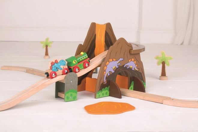 • 49 Teile: Gleise, Dinosaurierzug, Vulkan mit Tunnel, Dinosaurierfiguren und Bäume