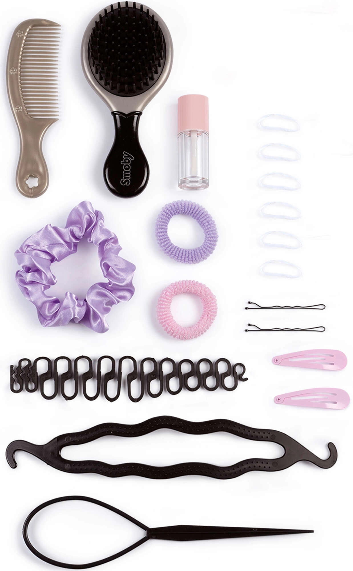 Bürste, Kamm, Haargummis, Spangen, Haarnadeln, transparente Gummis und spezielle Flechthelfer für müheloses Frisurenstyling.