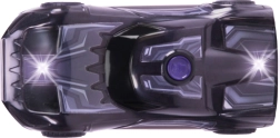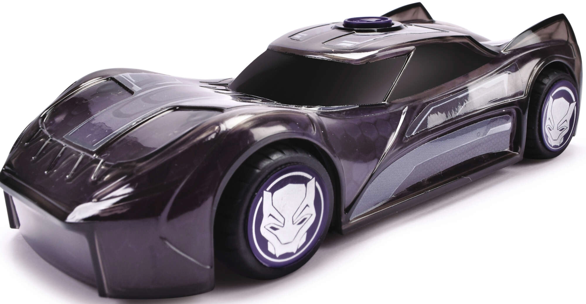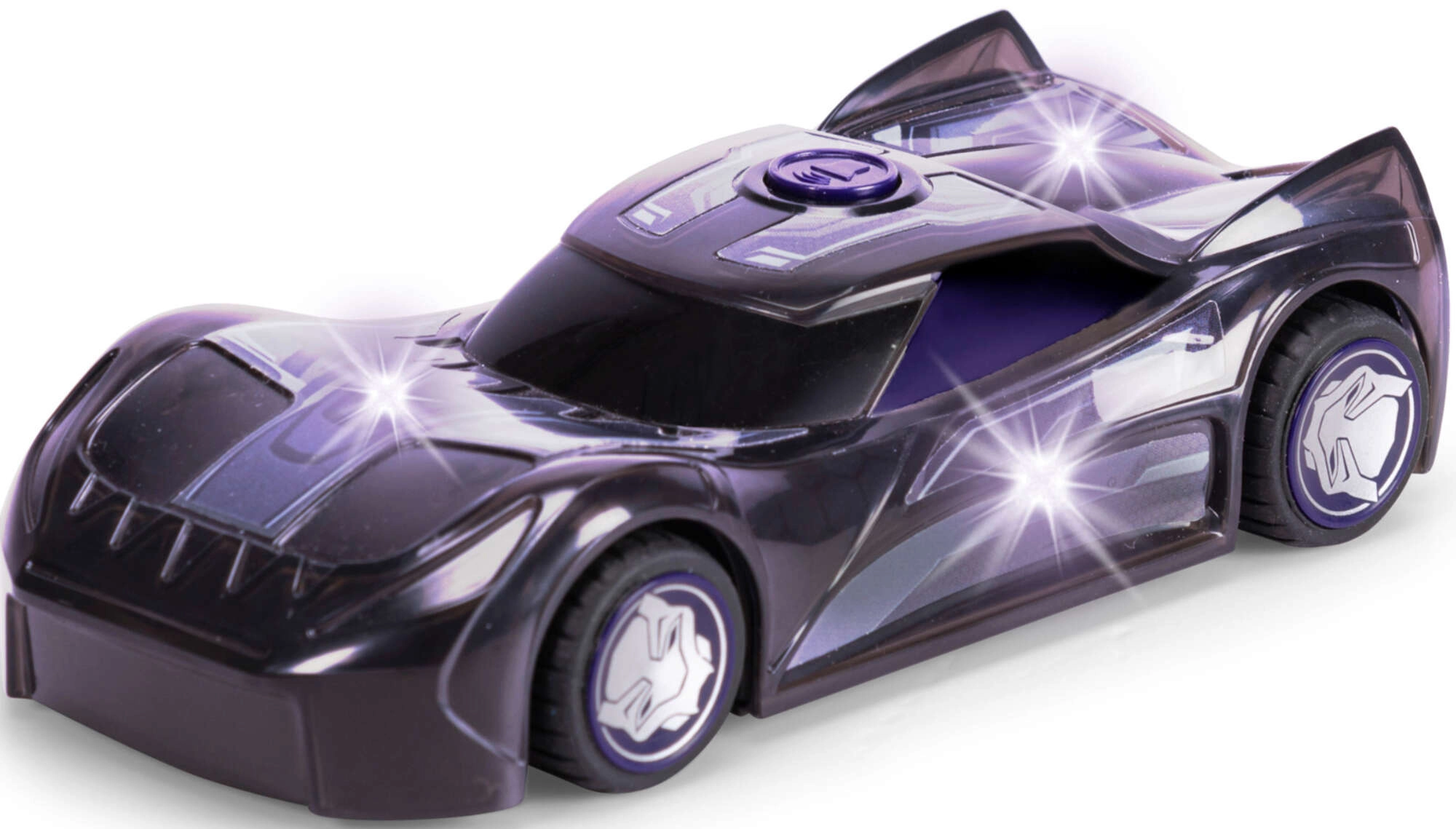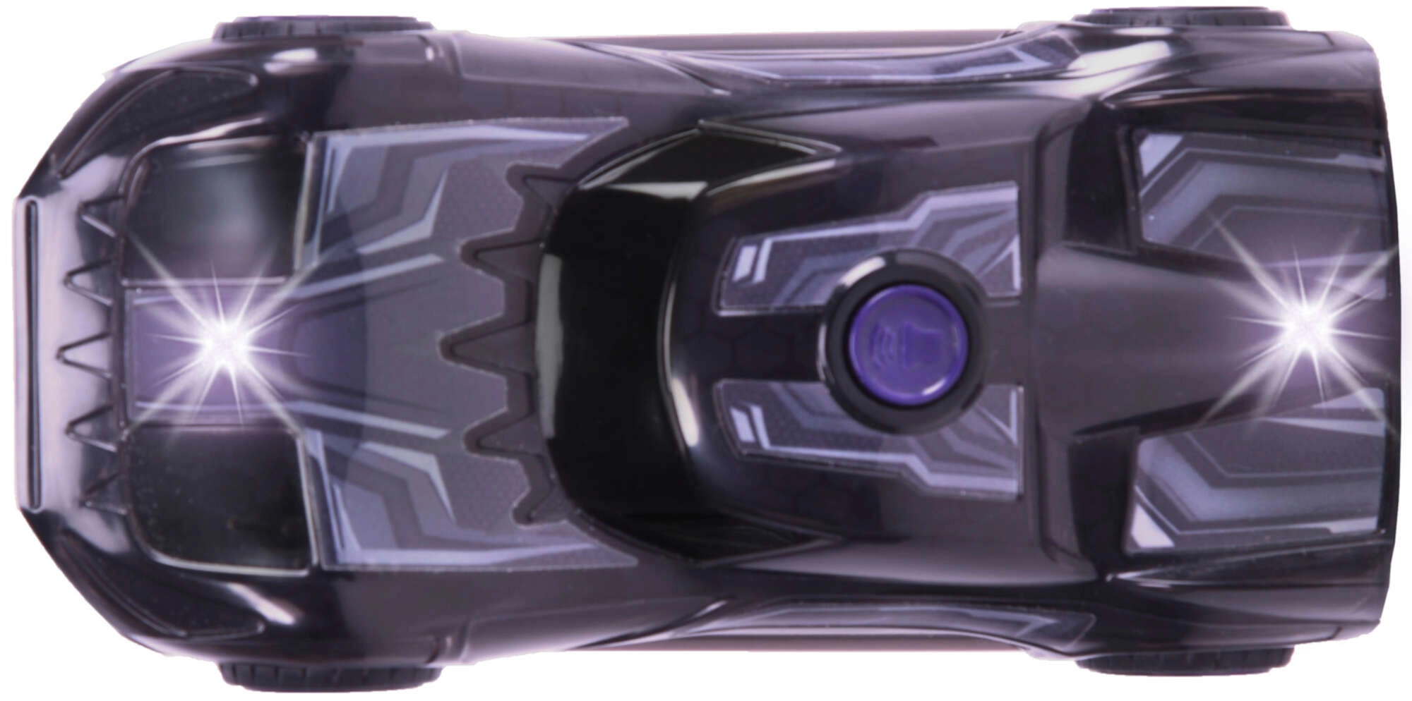 Starten Sie in eine actionreiche Fahrt mit dem MARVEL Black Panther-Auto. Die Karosserie mit Maskenmotiv und futuristischen Linien trifft den Stil des beliebten Helden. Per Druck auf die violette Taste aktivieren sich leuchtende Effekte über die gesamte Karosserie und authentische Sounds des Fahrzeugs und der Figur für ein noch intensiveres Spielerlebnis.