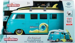 Der große interaktive Volkswagen T1 von MAJORETTE überzeugt mit präziser Verarbeitung und authentischen Details des legendären Campers. Der Träger in Form eines Lieferwagens in Blaugrün mit cremefarbenen Elementen lässt sich zu einem praktischen Spielkoffer mit Parkplätzen für das beiliegende Auto öffnen. Die vordere Taste in Form des VW-Logos aktiviert helle Lichter.